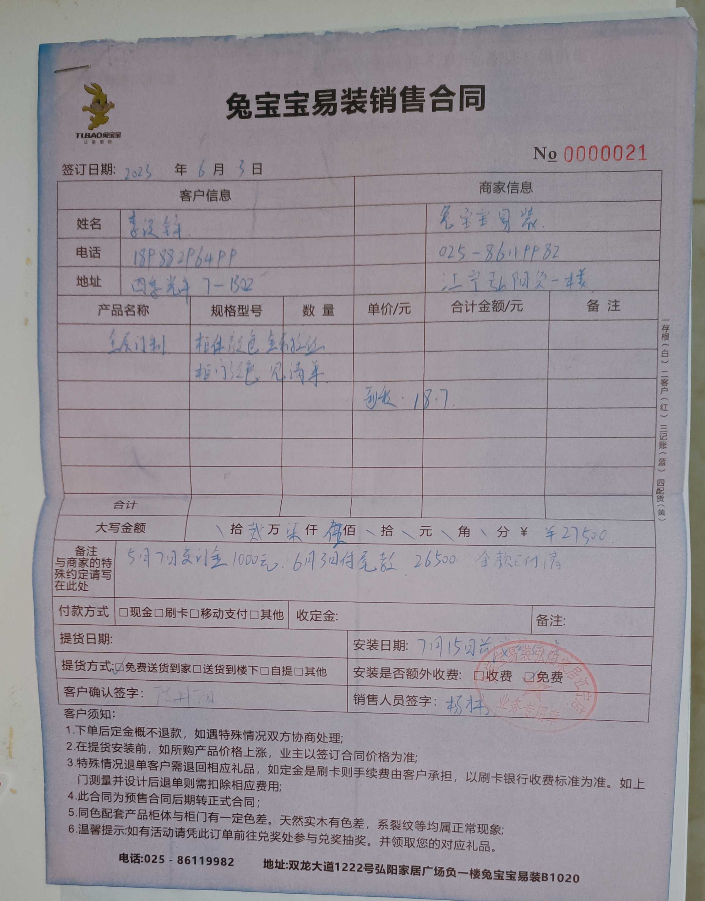 1、超合同期一个多月未完成柜子安装;2、安装四次仍有问题:第一次7.22安装(合同写7.15前装完),阳台全部门板及小房间一扇门有明显长划痕,阳台部分门板尺寸不对,在家锯板子还锯不整齐;第二次8.5安装,阳台全部门板有严重压痕,部分有长划痕,小房间一扇门尺寸短了;第三次8.13安装,五次改变约定安装时间,直到晚上9点半才到,门板没有兔宝宝防伪标志(绿标),小房间一扇门还是短,安装四扇门用时俩小时到晚上11点半,工具没带对,无法进行后续安装;第四次8.20安装,小房间一扇门还是有点短,比之前好点,但门上有压痕和洞;3、安装师傅不专业,没有安装确认单,直接转售后,售后处理拖拉,售后制度拉垮,没有契约精神,随意改变约定好的安装时间,客户电话搞错。以上严重影响装修工期,延缓搬家速度,延长我们租房时间,造成经济损失,且多次安装耽误周末及平时时间,长期因为这件事心情不好,失眠。考虑多次拆装门板,导致柜体上螺丝洞越来越大,对后期柜门牢固度造成极大影响,所以告知商家不再进行第五次拆装,仅要求赔偿3000元经济损失,商家却告知最多赔付1000元,请求有关部门协助解决,并对损害消费者利益的商家做出严肃处理。