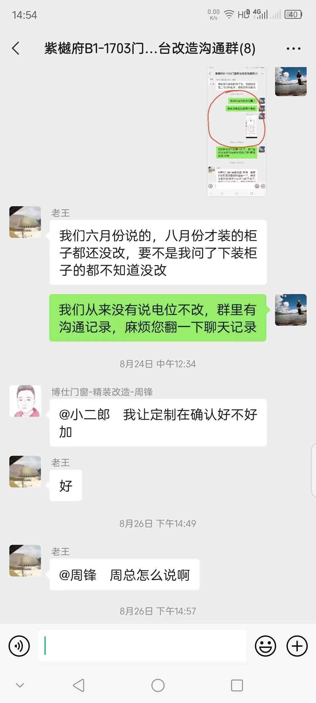 在与博仕门窗沟通时,我与工作人员明确表达了我家线路插座改造的方位,工作人员也给予了回应。但最后工作人员并未改造电路,(后来工作人员也承认是工作失误,忘记改造),但是后续我家墙上的柜子已经打好并安装上墙了,导致无法再进行电路改造。 起初博仕工作人员推三阻四,一直不肯上门核实电路改造的问题,后来告诉我们,因为柜子已经安装好了,没办法再进行电路改造了。从头到尾没有表示任何的歉意,也不愿意给出后续解决方案,一句没办法改造了,就把消费者打发了。甚至要求消费者额外付钱才能完成补救方案。 我要求南京博仕门窗专卖店(迈皋桥弘阳广场店),给出说法,给与解决方案!