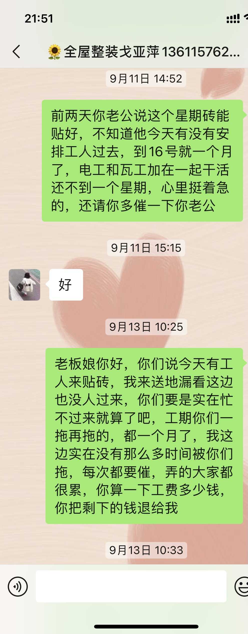 施工方拒不接收调解,已告知消费者。还需要消费者通过其它渠道进行维权,确保自身权益不受损害。 | 2023-11-08 |