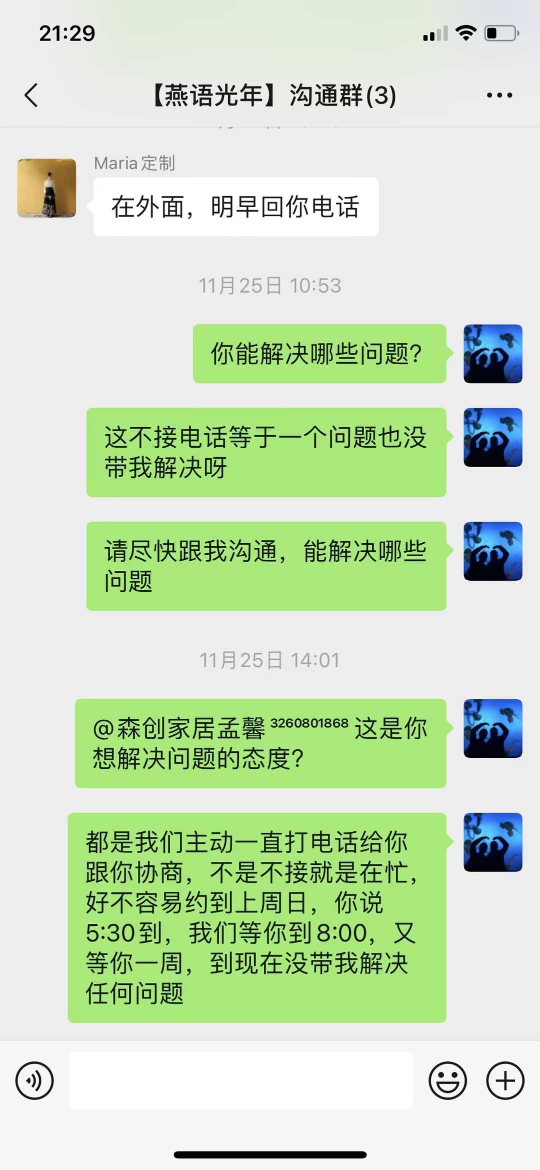 | 投诉类型 | 售后推诿 | 投诉人 | 易** | 被投诉单位 | 南京森创家居有限公司 |