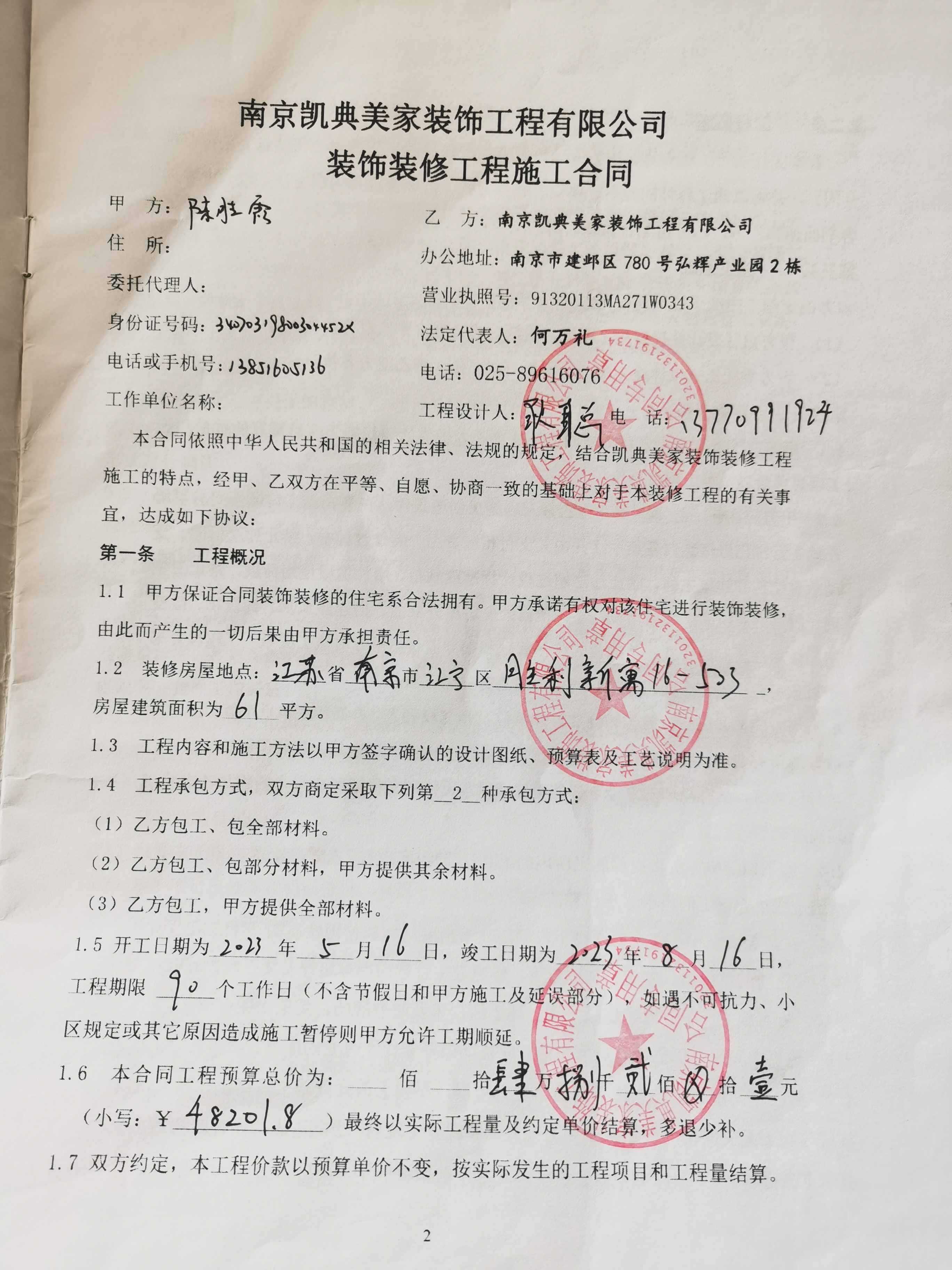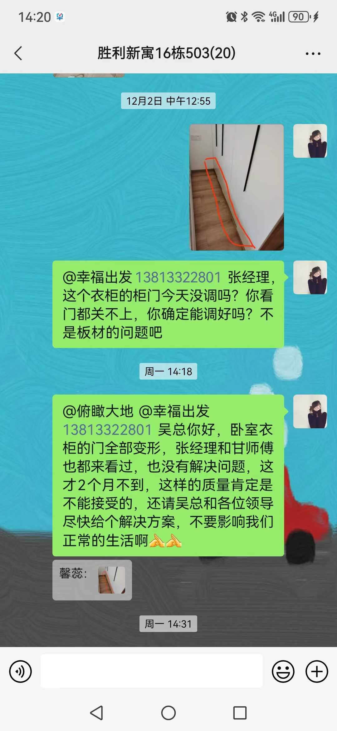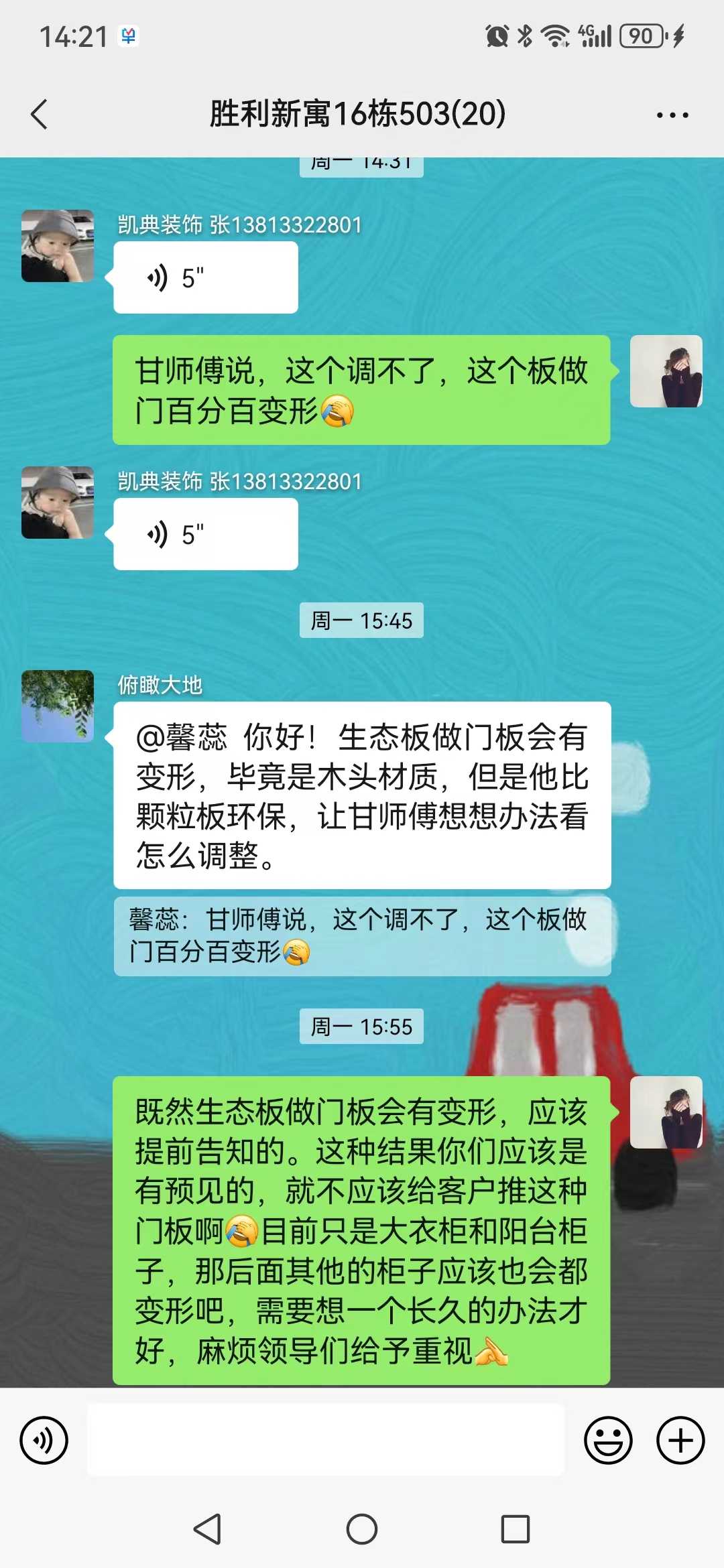 2023年5月14日本人与南京凯典美家装饰工程有限公司签订全包合同,于2023年5月16日开工,工期3个月,今年的9月中旬基本完工,10月份的时候,发现家里卧室柜门就有变形,当时致电项目经理反应,项目经理表示“二次油漆修补的时候过来一起处理”。直到上周六(2023年12月2日)油漆师傅上门二次修补,我强烈要求项目经理一并过来,过来看了一下情况,当时没有处理,就匆匆离开了,当晚我再次联系项目经理反应柜门问题未解决,直到第二天,木工师傅才来,木工师傅看过,表示柜门材质为“多层实木”,变形是一定的,直到此刻我才知道,装饰公司当初为了顺利签订合同,压低成本,在明知道多层实木板材不适合做柜门的情况下,还是选择用这板材做柜门,导致装修一个月左右时间,卧室柜门全部变形,阳台的柜子也有轻微变形,我家当初定制柜门的面积在23.4平方米,卧室柜门大概4.8个平方,也就是说还有差不多20不到的平方柜门有变形的风险,只是时间早晚的问题。之后,我也咨询了一些做柜门的,针对柜门变形的补救办法,结果就是这种板材压根就不适合做门,若变形,根本没有很好的处理方法。12月4日,我再次联系凯典装饰吴总、项目经理、设计师,表达了我的述求:要求换门!希望尽快解决,毕竟年光将至,我计划元旦搬家,他们就一推我,我推你,一直也没有明确的态度。