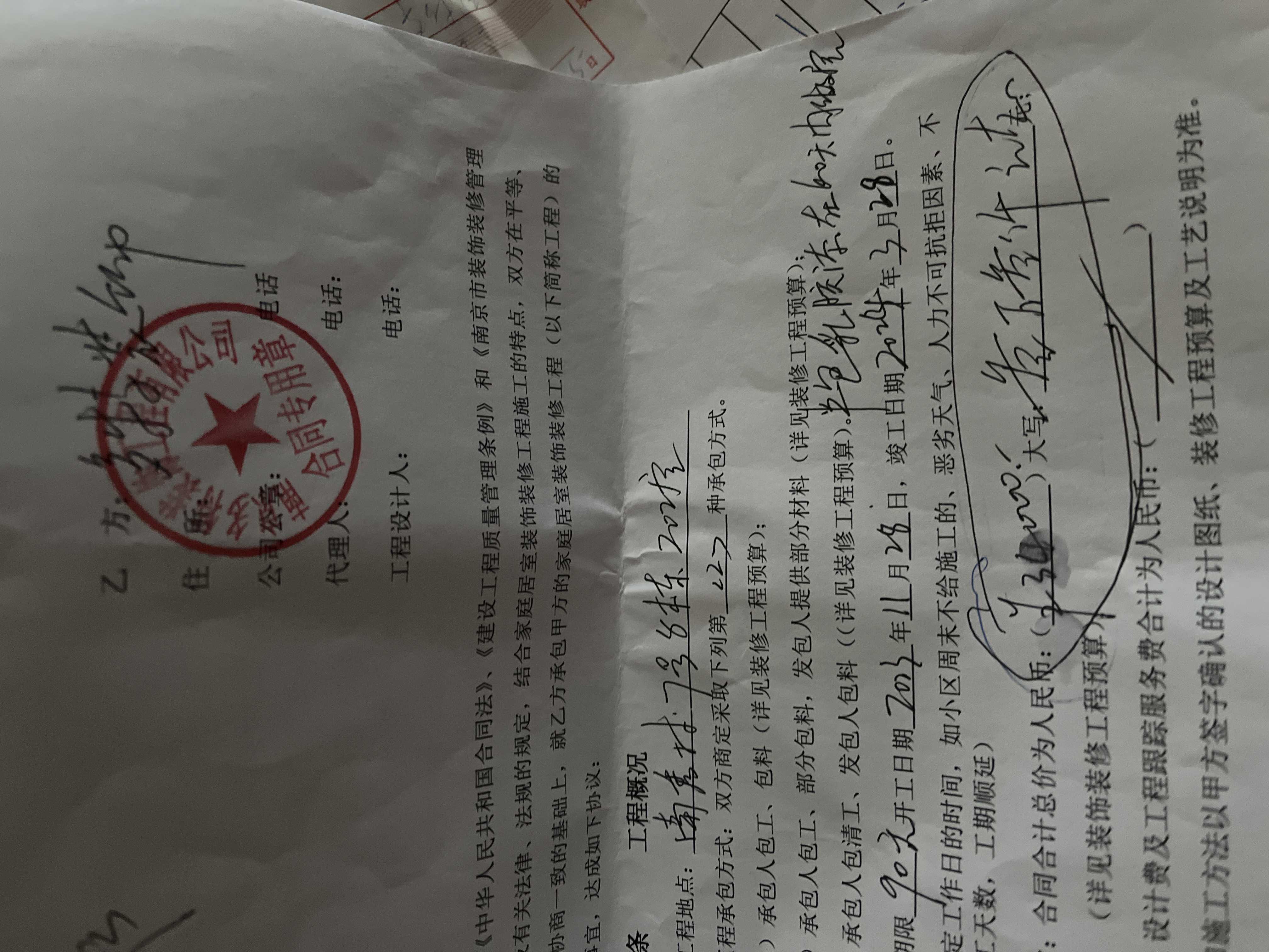 经商量半包工程,包括拆旧,水电全改,瓦工和油漆由于他们收费项目很多,当时我们也没有细看,回来后看了具体内容,考虑现在地面是瓷砖,拆除后地面不平,无法进行地板安装,这个应该是在半包范围,但开工当天,就和老板协商,老板完全不答应,多特老板认为谁也不能保证拆除后地面是否平整,如果需要找平就要另加2000左右的费用,或者另找人搞,或者木工找平,我们认为这个应该是瓦工的事情,每个项目应该由施工方提前考虑在签合同前考虑在内,不应在开工时提出另加费用,否则我们要找你半包干嘛?公司老板曹某讲话强势,善于狡辩。譬如开工当天反复讲你们就是一分钱不想花,让别人为你干活,这是哪里的话?明明是你没开工就开始增项加钱,这也是你施工方提前挖的陷阱,你为什么不提前列出来!!我们作为非专业人士怎么能考虑到如此细,我们不花钱你会干活!!!所以开工当天为此争论不休,双方都不开心,结果当天没有开工。