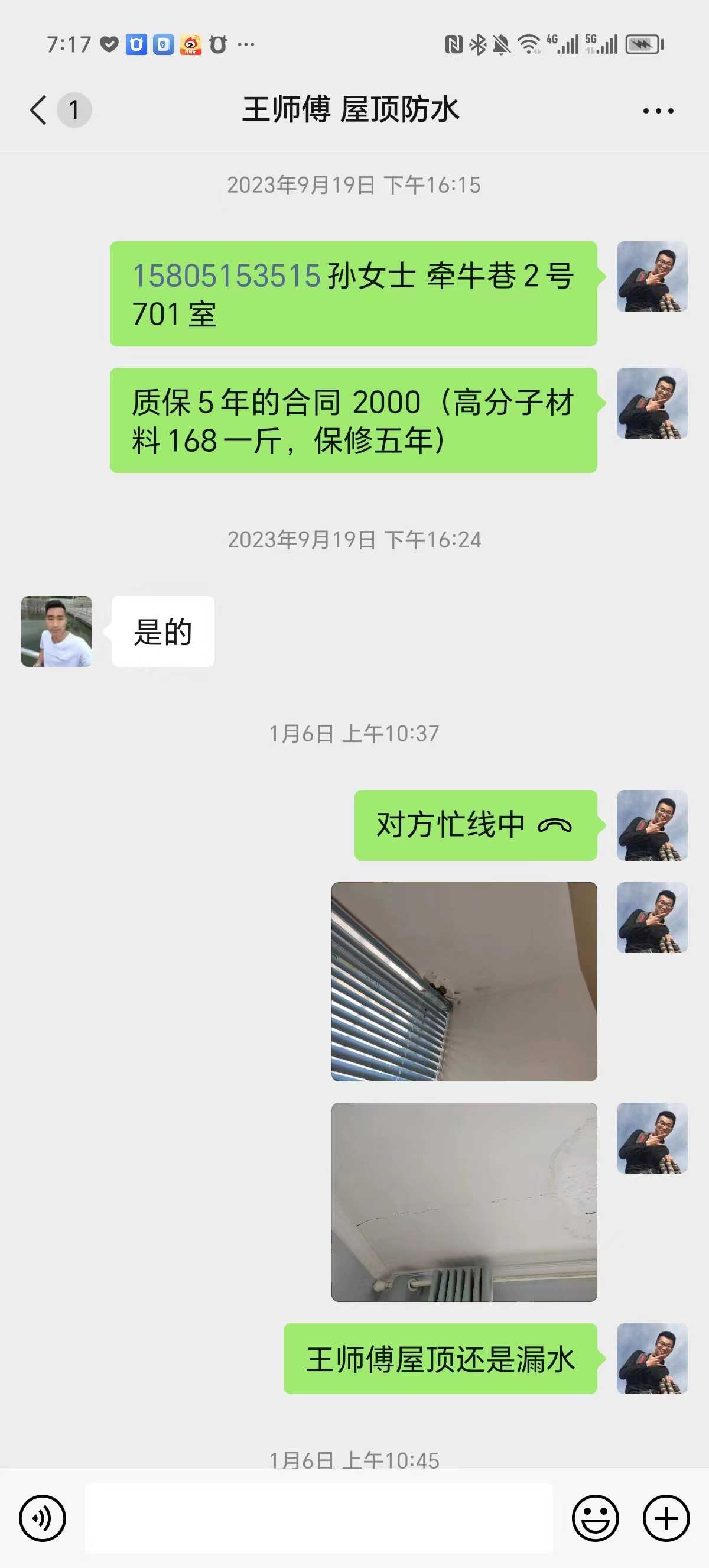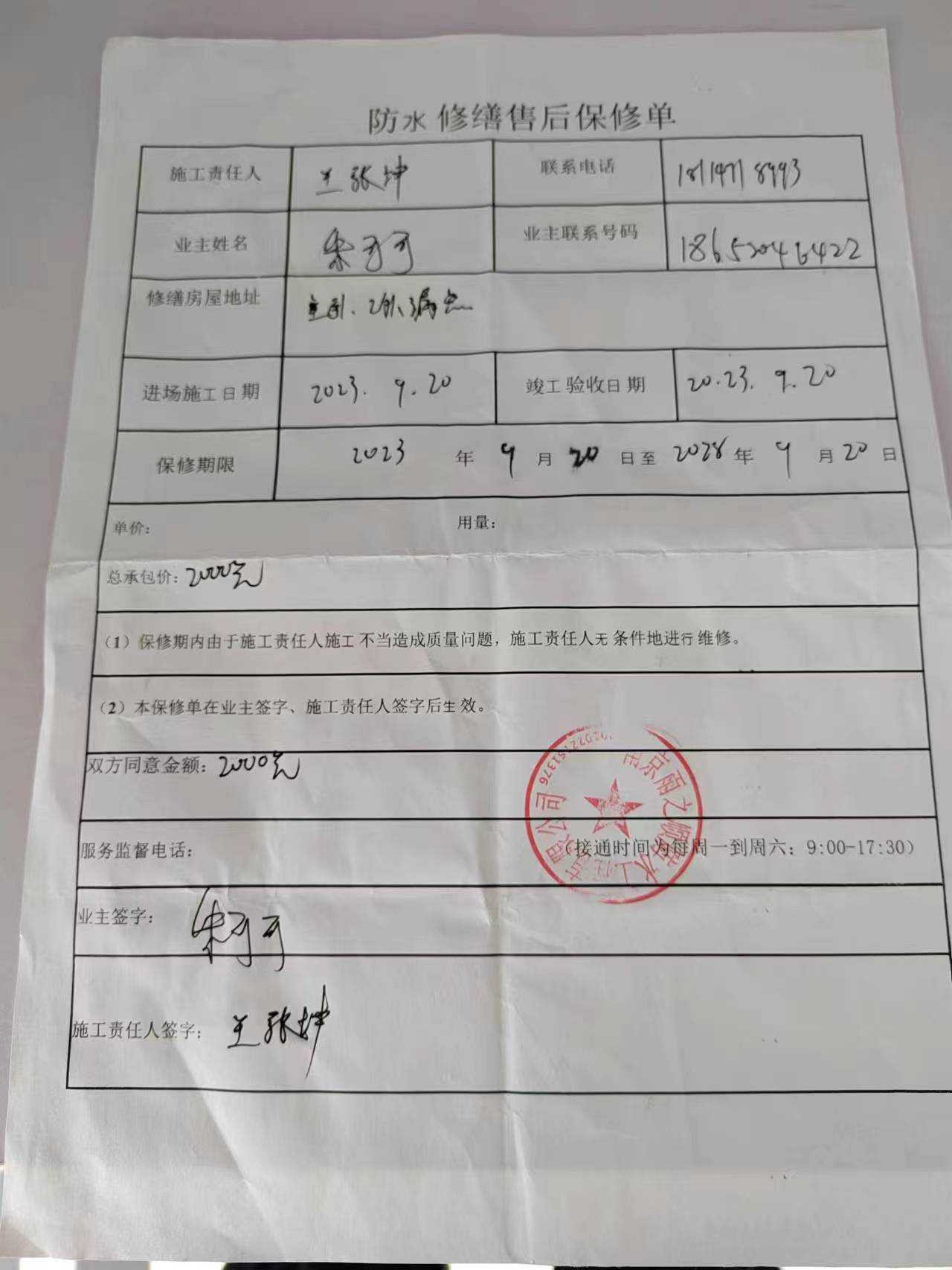 1.施工完后有质量问题,继续漏水。选用的材料是商家承诺质保5年的