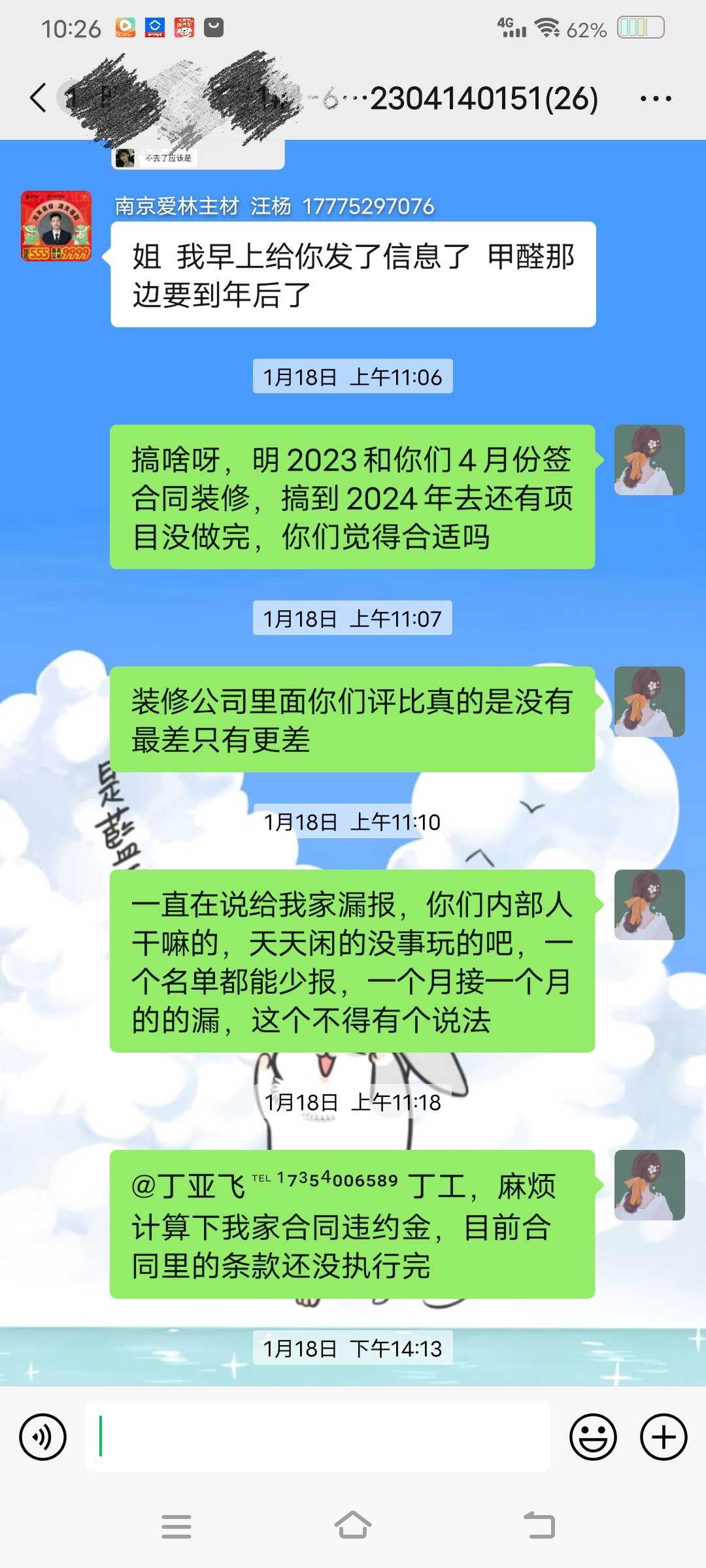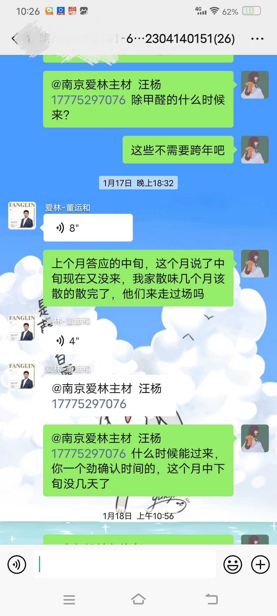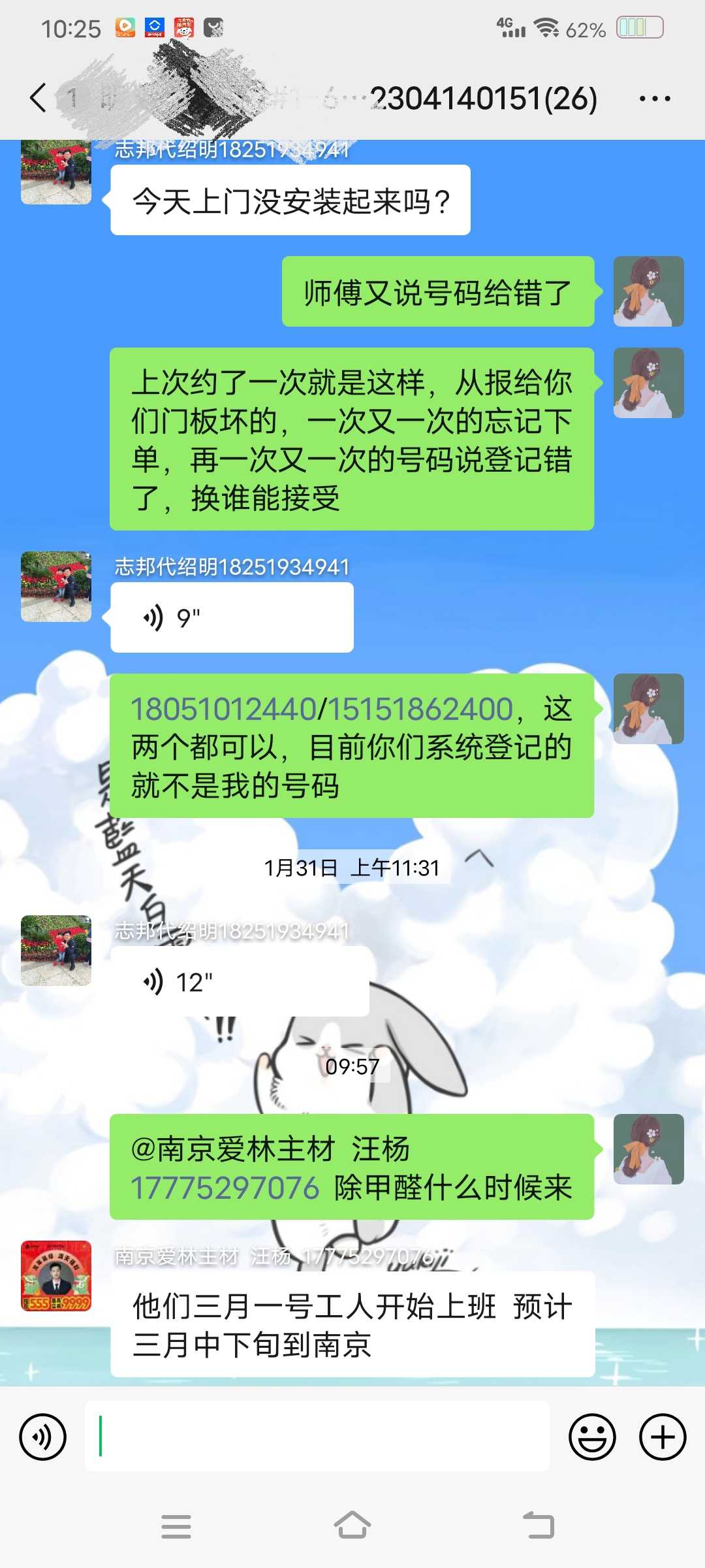 施工方回复除甲醛业务团队会在3月中下旬来南京处理业务问题,具体时间会和消费者沟通联系。 | 2024-03-01 |