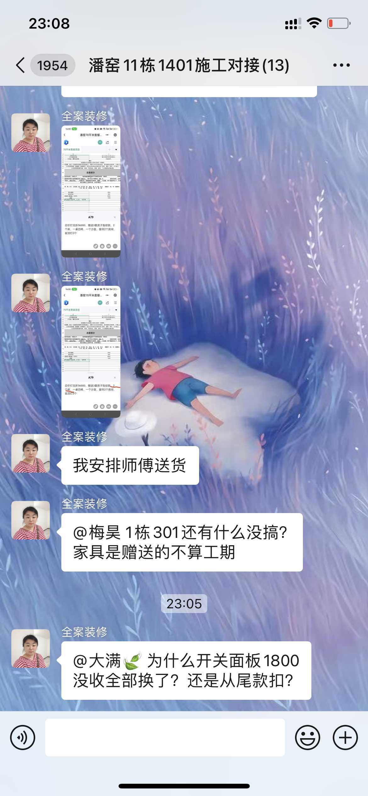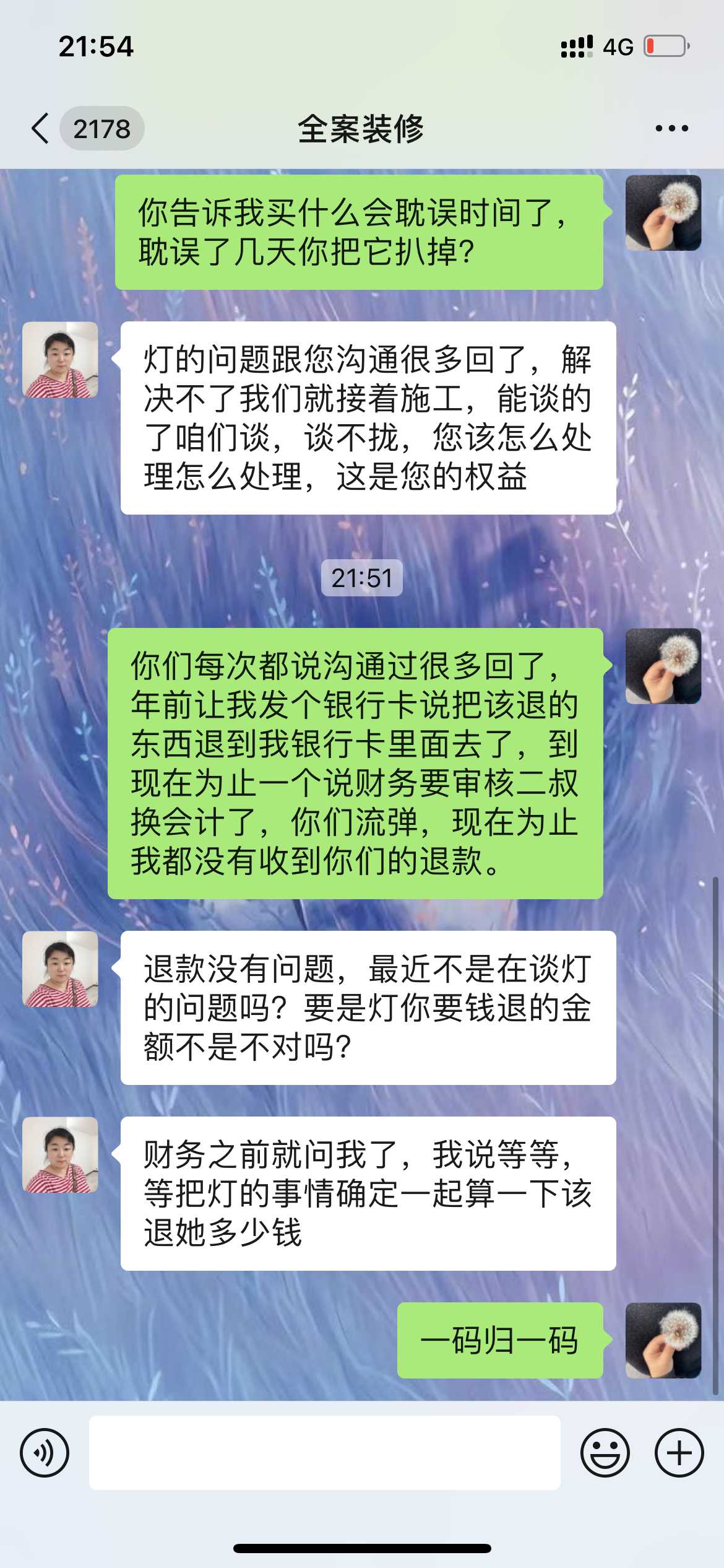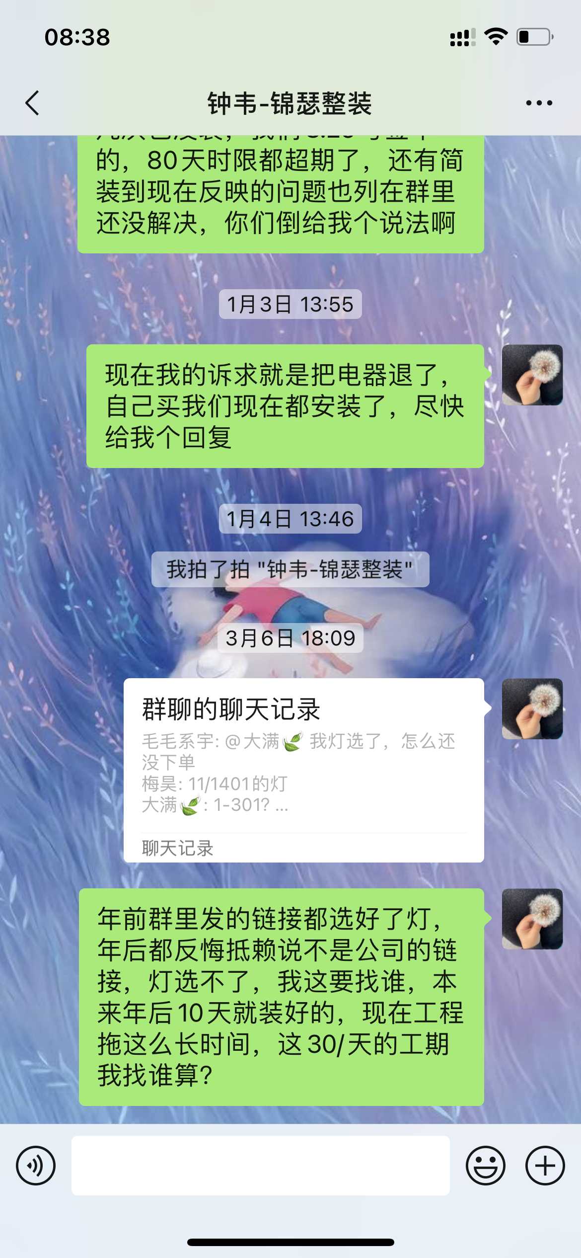投诉请求事项:1.合同期间未完工,要求退合同外违约金,30元/天赔偿损失,我于2023.8.25号和该公司签订装修合同,工期80天,超出时限太长,沟通无果,特此要求赔偿工期,2.装修款项全部结清,地板,开关,水槽,三角阀这些未在装修公司选择,按照合同收取费用的7折退给我,银行卡已发给装修公司,还有电器13000未按约定时间,皆以财务审核未打到我卡里,要求尽快给出赔偿期限3.2023.1.19号微信群里给我选材链接,1401和301的灯具,我们按照时间给出灯具图片,装修公司先是以全铜的灯具不能送要加钱,不认可该说法,而后以不是公司图册为由说自己发错链接了在群里,让重新选,最后说送的灯价值只能在1000元以内,我们不懂什么铜不铜,只知道装修公司每次能选的东西都会在群里发,我们也是一板一眼的按照他们发的来选,这次选材也是,但更离谱的是他们最后说这个厂(志诚照明)倒闭了,我就反问她一句,怎么每次给我选材,都选好了,你们工期慢,最后到安的时候都说让选别的东西,一问都是不合作了,一开始的双虎家具也是签的给发的宣传照片,等选好了说不跟厂里合作了,让选极简家具,还有石材台面也是,定制群里都选了,后来又说公司不合作了,这次不是志诚照明倒闭了,而是装修公司一贯用的手段,我多次和他们交涉包括他们的售后电话13851954689都说设计师还有销售经理会联系我,结果等了快一个月都没人约我线下沟通,最后只能打他们老板钟韦电话1362****555,多次无人接听,忙还是不想接不得而知,赶巧换号打通一次是一女员工接听表示是公司备用机,跟她反映事情,她说跟设计师还有销售经理对接,3.23号肯定会有人找我沟通,结果还是没有,他们公司的诚信呢,至今工期遥遥无期,无法开展,诉求就是作为公司老板应当面解决问题,业主问题微信沟通多次还有12345投诉多次无人过问,我们301和1401房子现在交付都7个月了,工期迟迟未完工,里面问题一堆,选材受阻,别人二批三批拿房的都装好了,我们一批的被晾在一边,希望家委会能给我主持公道,给我解决这个难题,谢谢.
