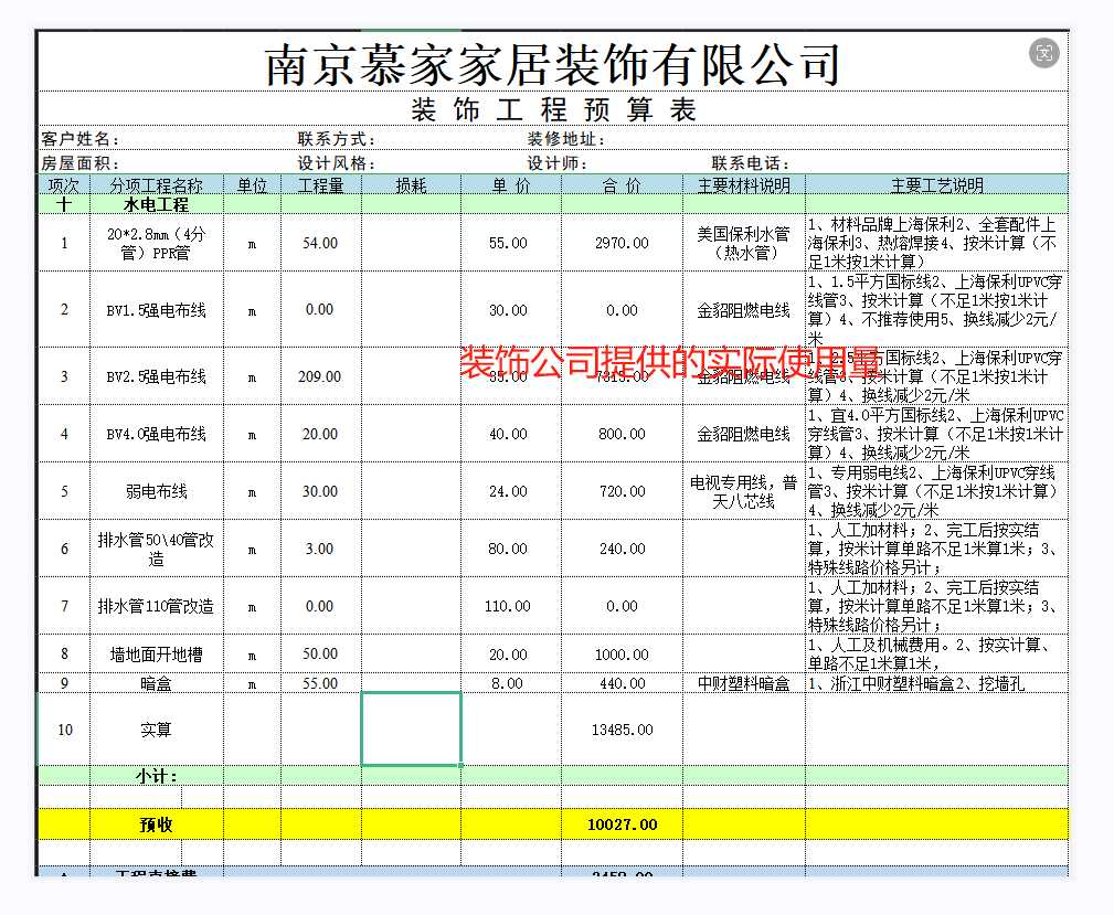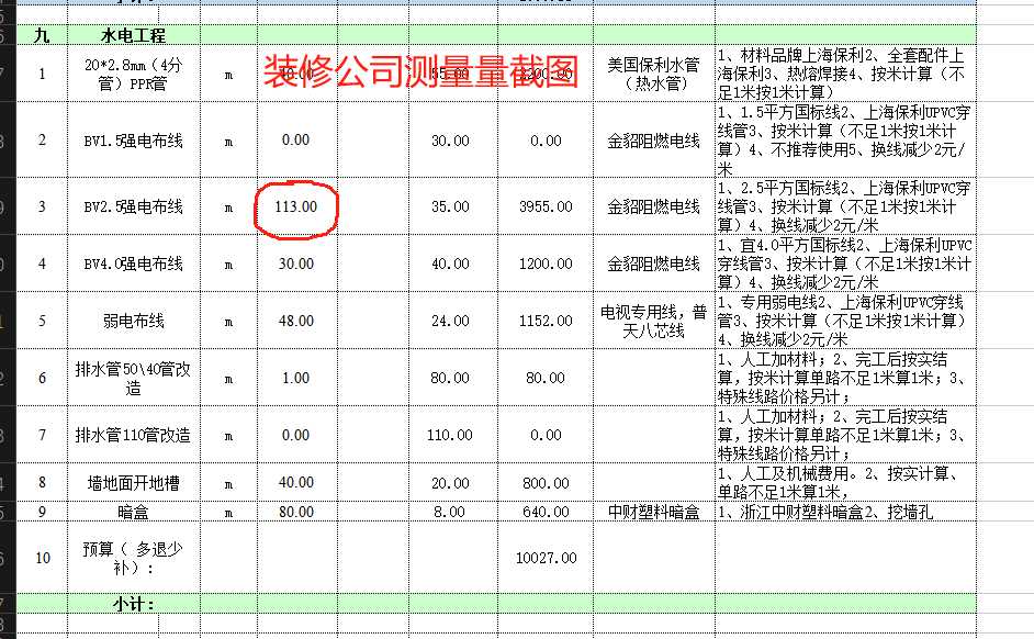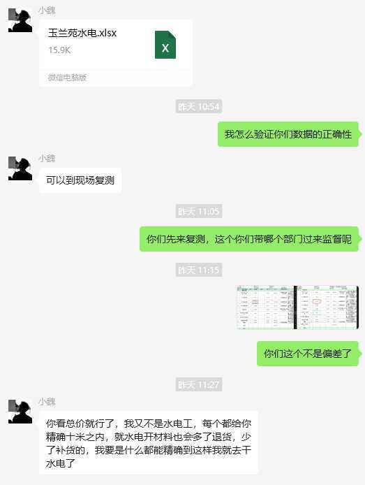 在支付完第二笔款项的第二天,设计师以水电用量超出为由,向我索取3974.97元。对方说合同水电不是包死,要以实际使用量为准。本人对比测量的用线米数和实际使用的米数,差距非常大,仅BV2.5强电布线这一项,测量量是113米,实际使用量却是209米(可以看截图),由于存在非常大的差距,我与对方进行询问,对方表示自己不是水电工无法精确测量(看截图)。