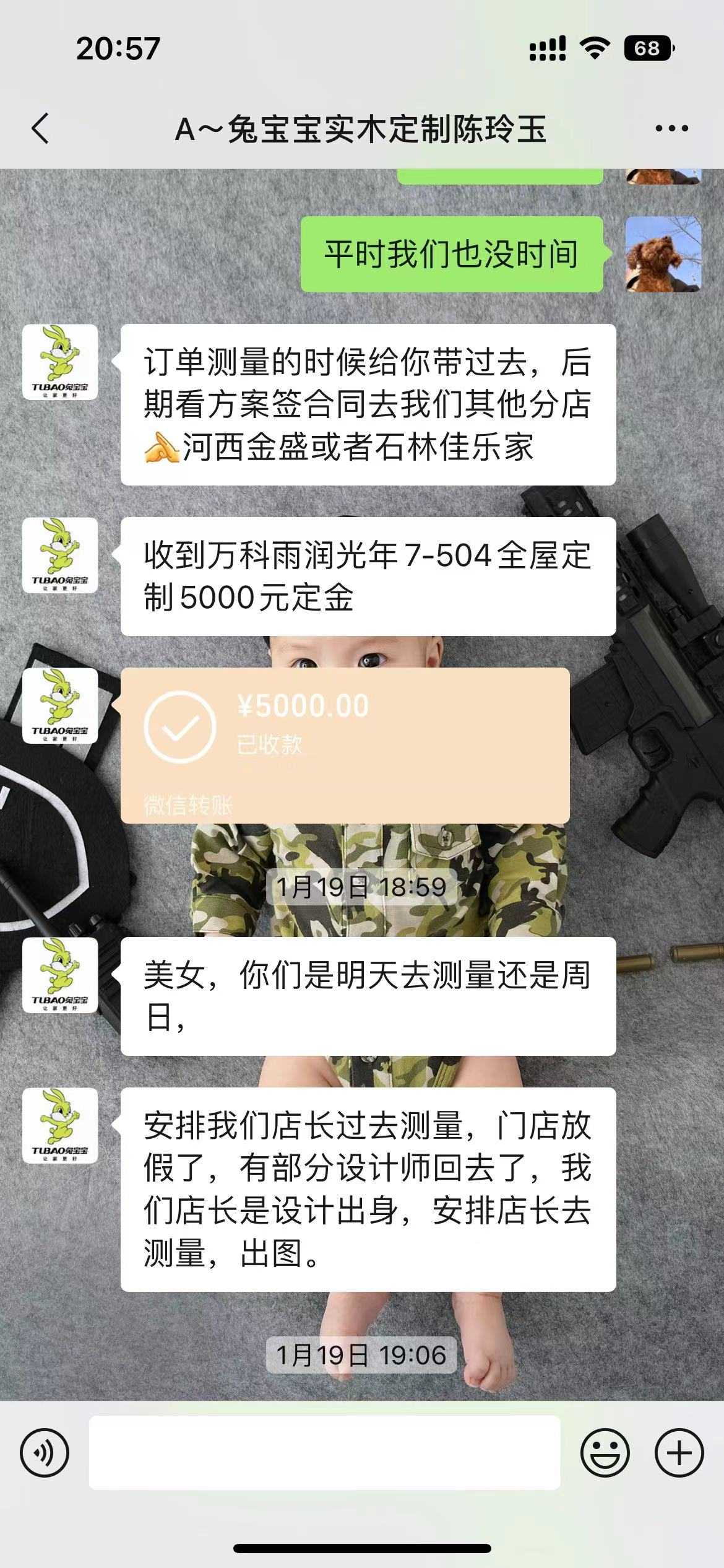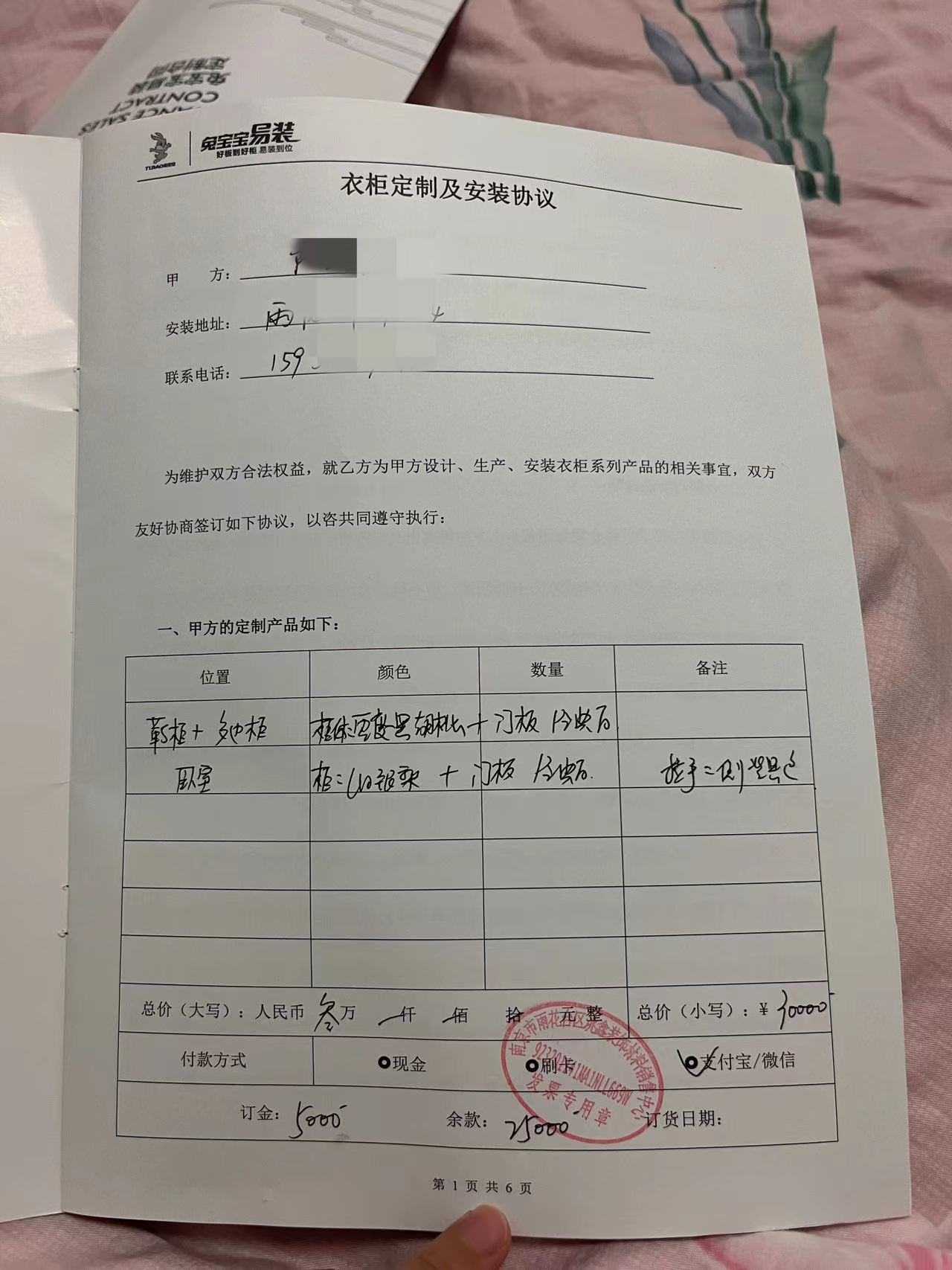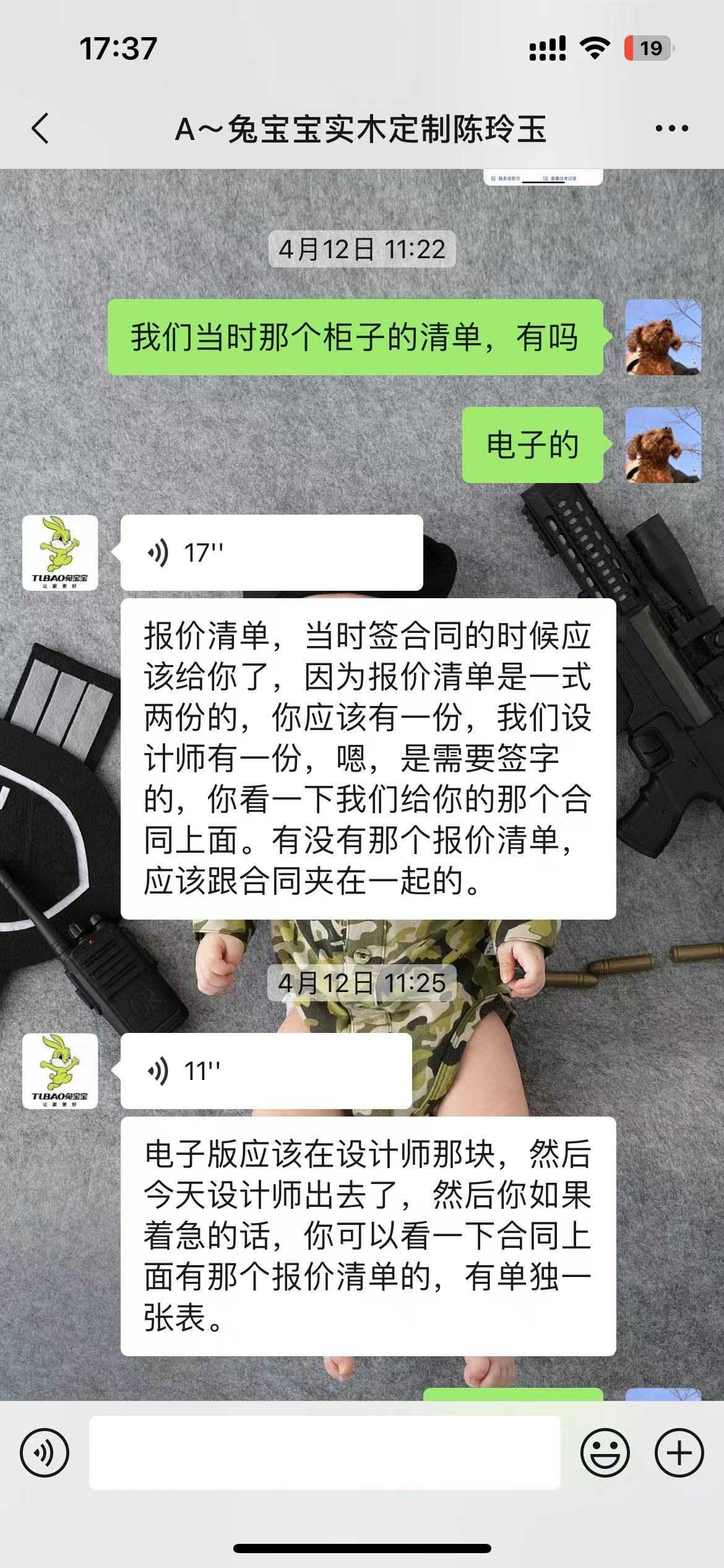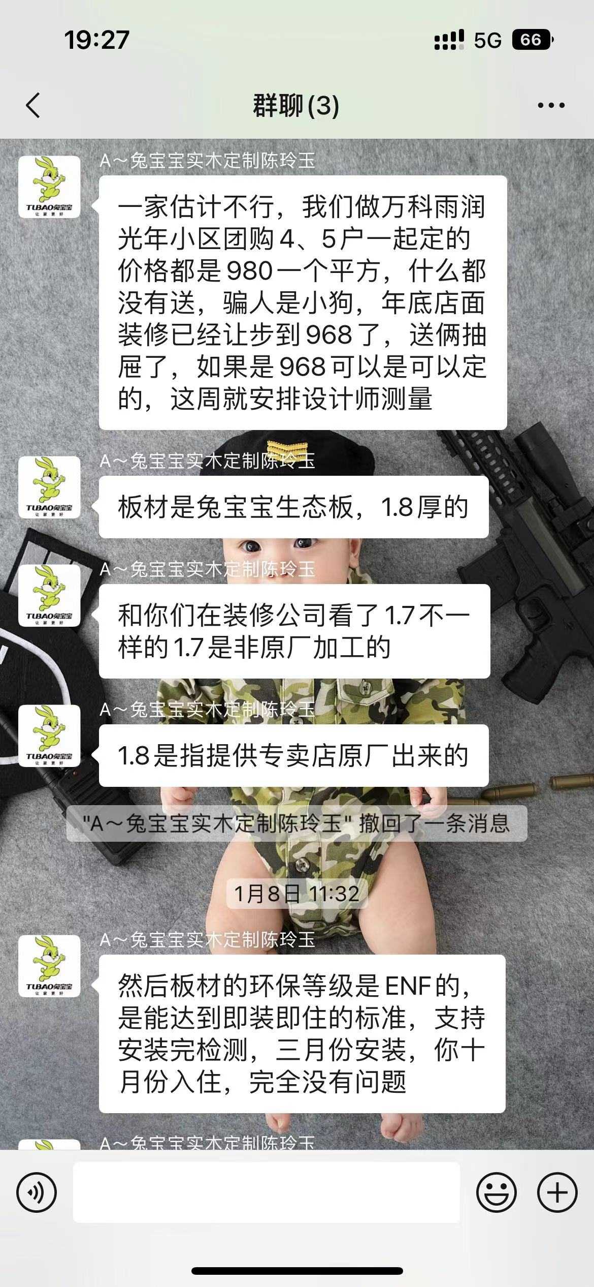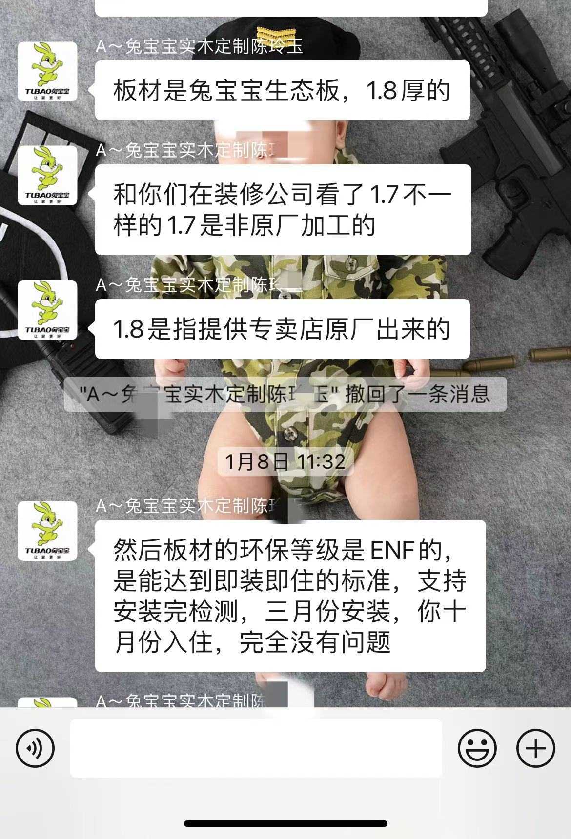 微信介绍兔宝宝板材为18mm,环保等级都是ENF,从未提过他家有17mm的板材,还一直贬低17mm板子不好,我就默认给我的报价940一平是18mm,ENF的板材,定好方案后选颜色,给了17mm的板材去选色,只让我选颜色,并没有告诉我这个颜色只能做17mm的,不能做18mm,到货安装的时候才发现板材厚度17mm,环保等级E0,全部降一级;