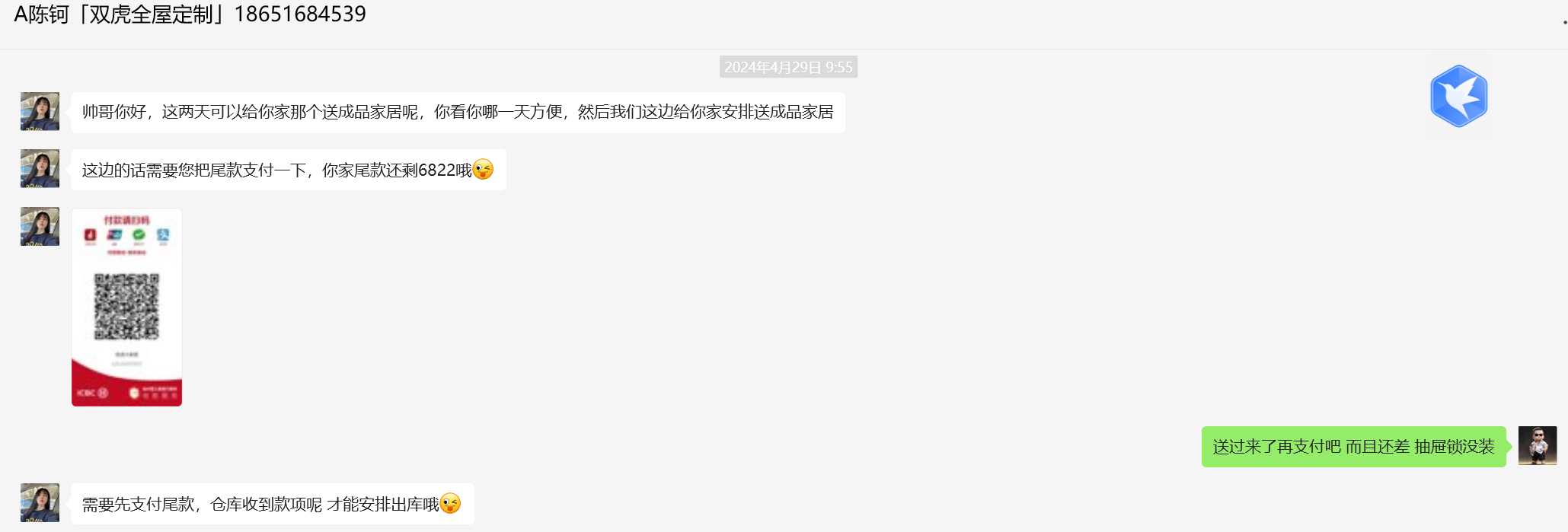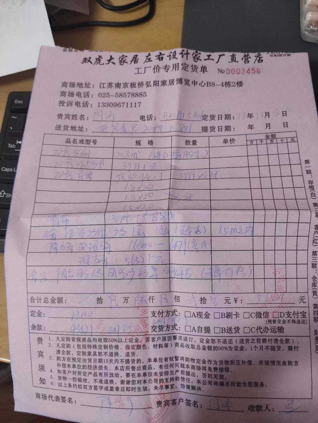 我家 南京市江宁区德信星宸5-801。2023年与南京双虎签订全屋定制合同(地址是:江苏南京板桥弘阳家居博览中心B8-4栋2楼)。合同分三次给付。最后一笔给付即尾款6822元,当时说好的是货送到安装完毕后一次性给付,但现在双虎 要求先给5000再送货,送货后再给1822元。我要求先给3000,其余的送货安装没问题后一次性给付,双虎不回应,至今月有余。
