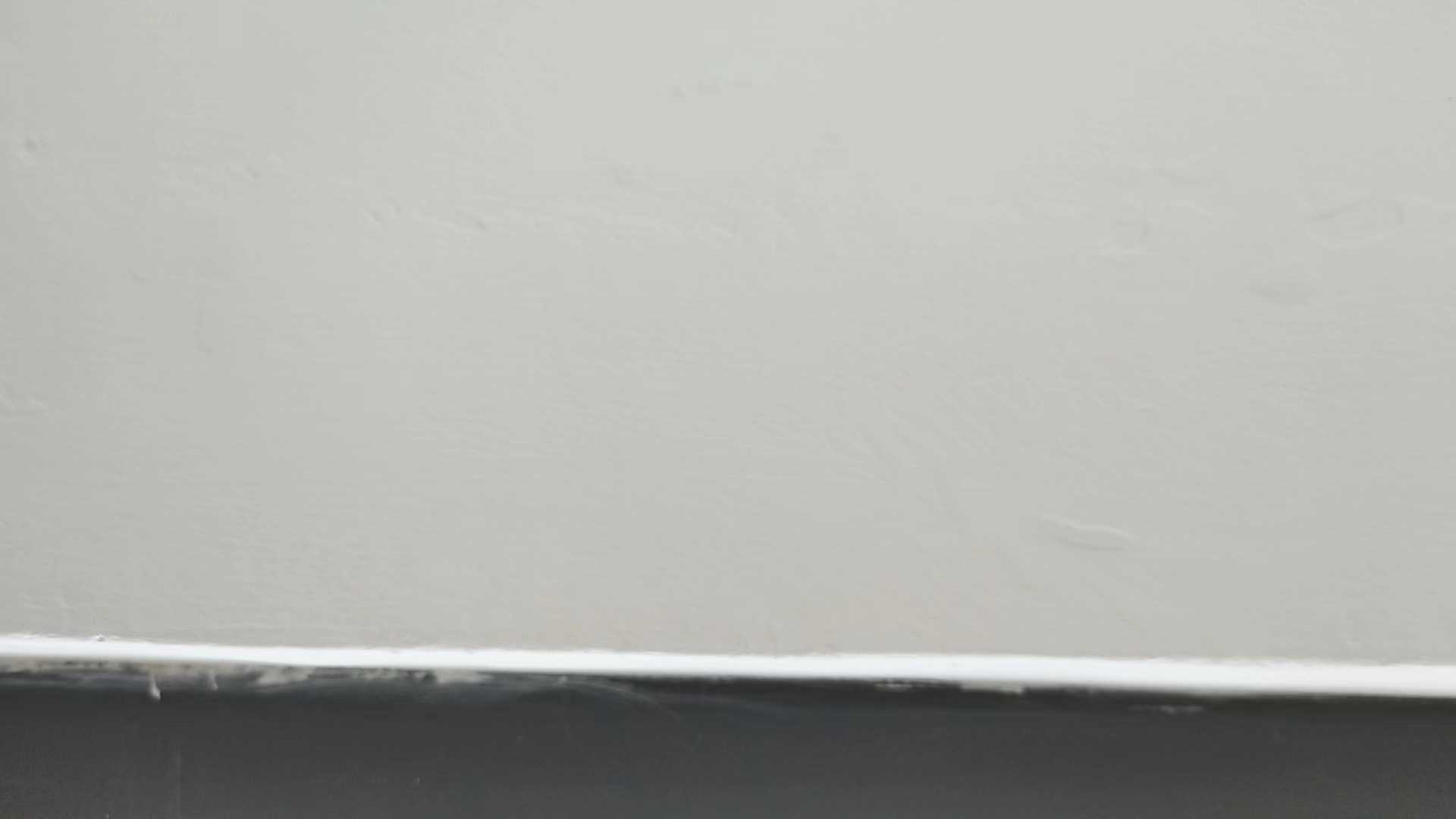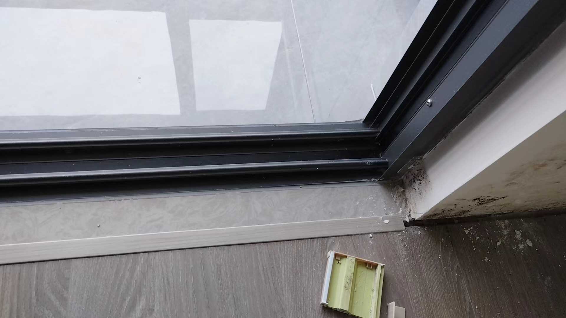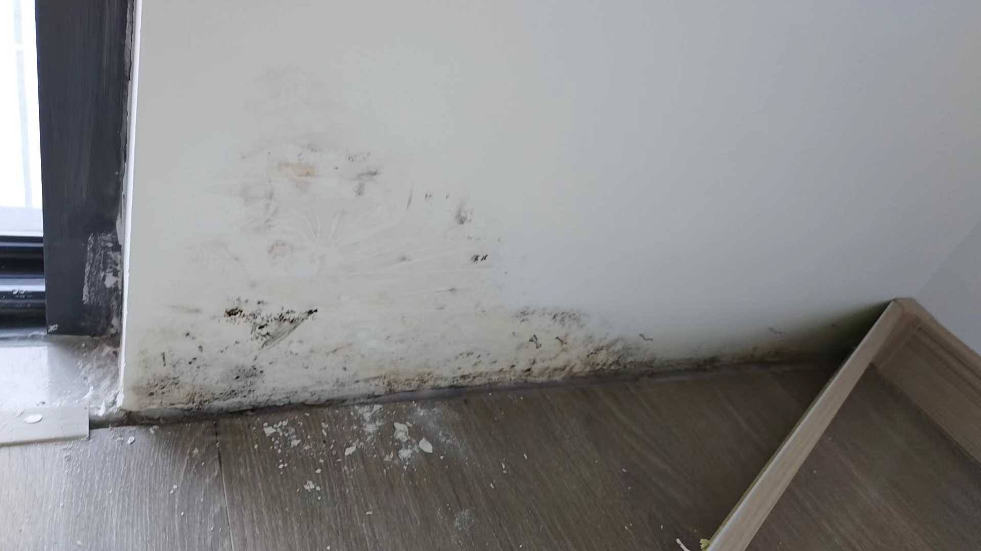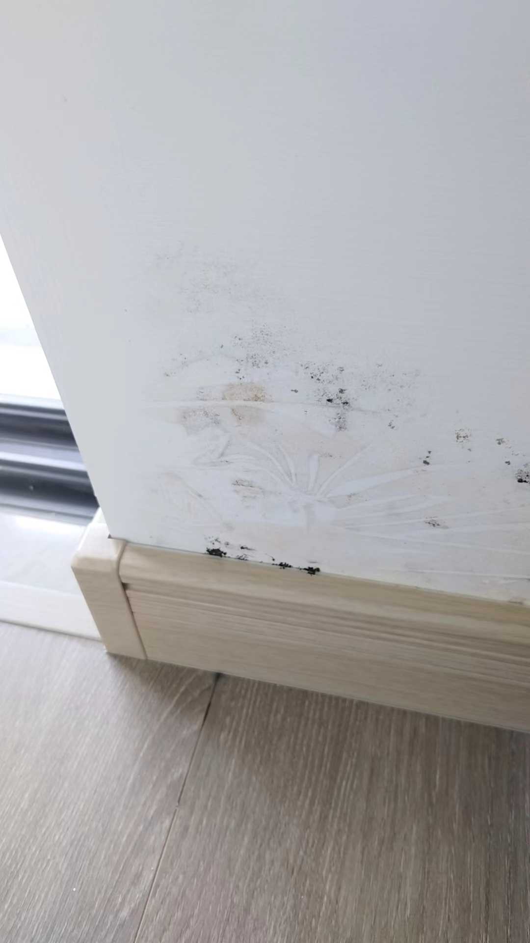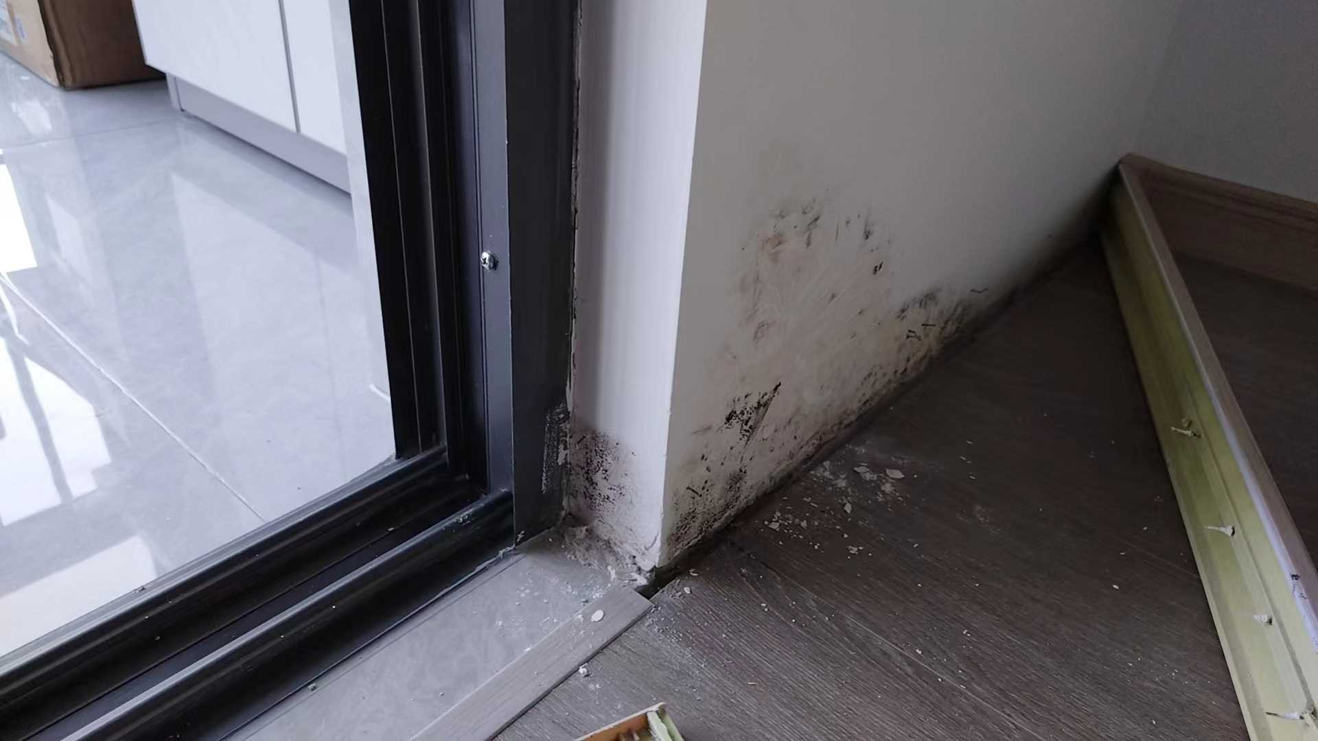问题:一是阳台改造造成墙体渗漏,客厅推拉门内侧墙体约40cm高潮湿发霉、附近强化地板发霉(开发商精装交付,推拉门没有拆且客厅内没施工,没有水源引起渗漏),二是洗衣柜中间插座位置不当,不方便使用,要更改到合理的使用位置,三是阳台改造施工造成推拉门顶部开裂,粉刷不符合要求,需要重新粉刷。