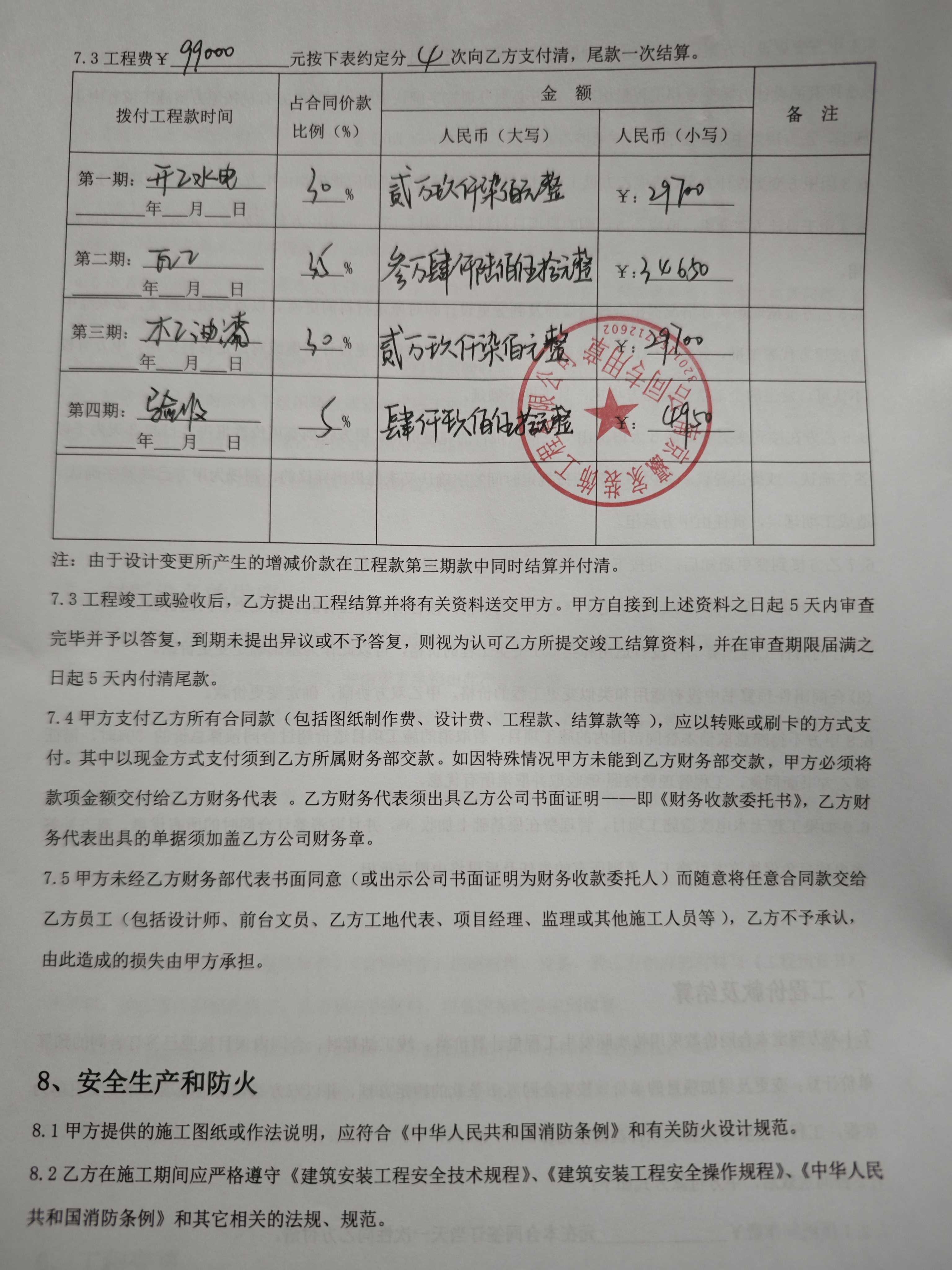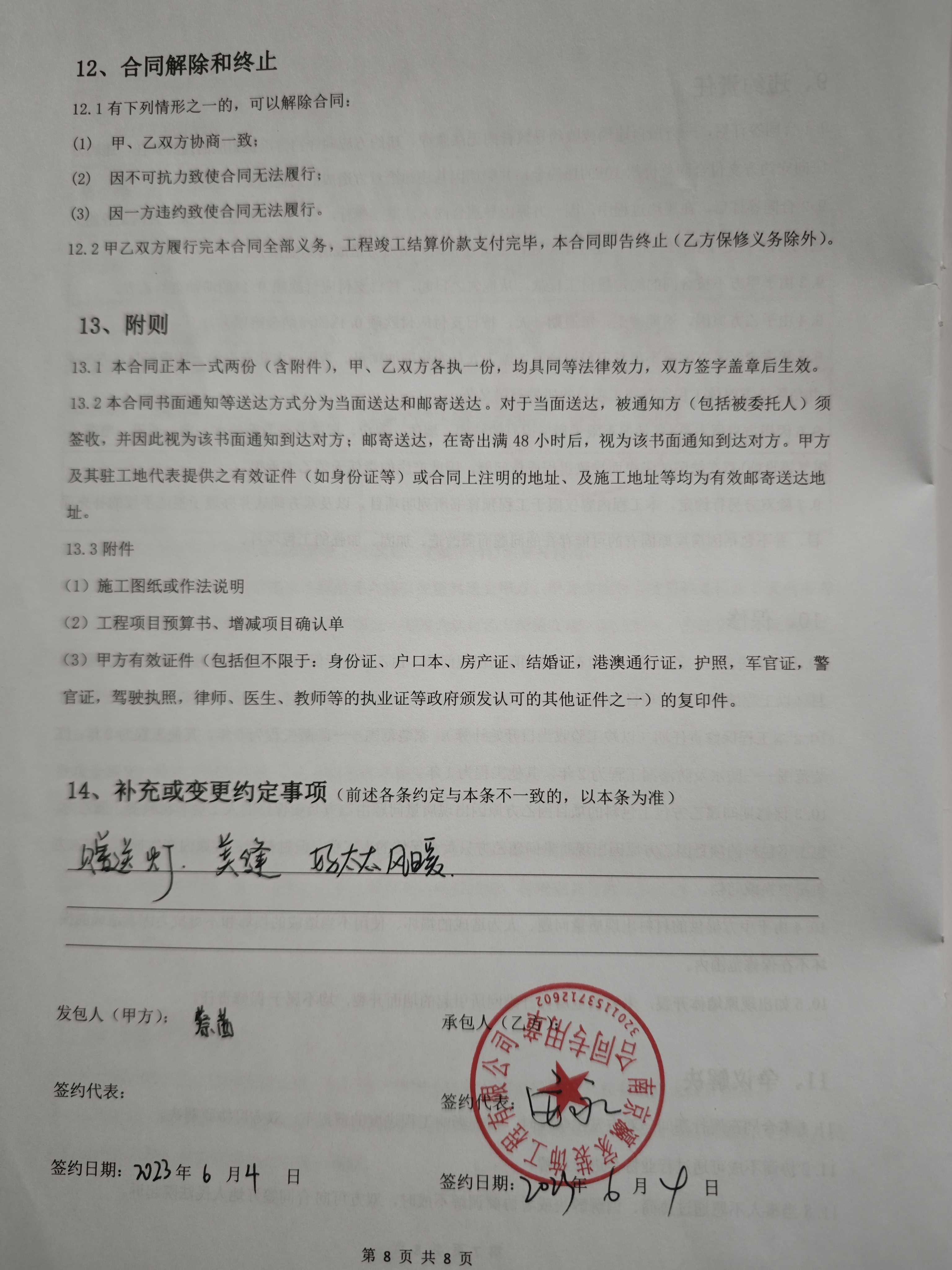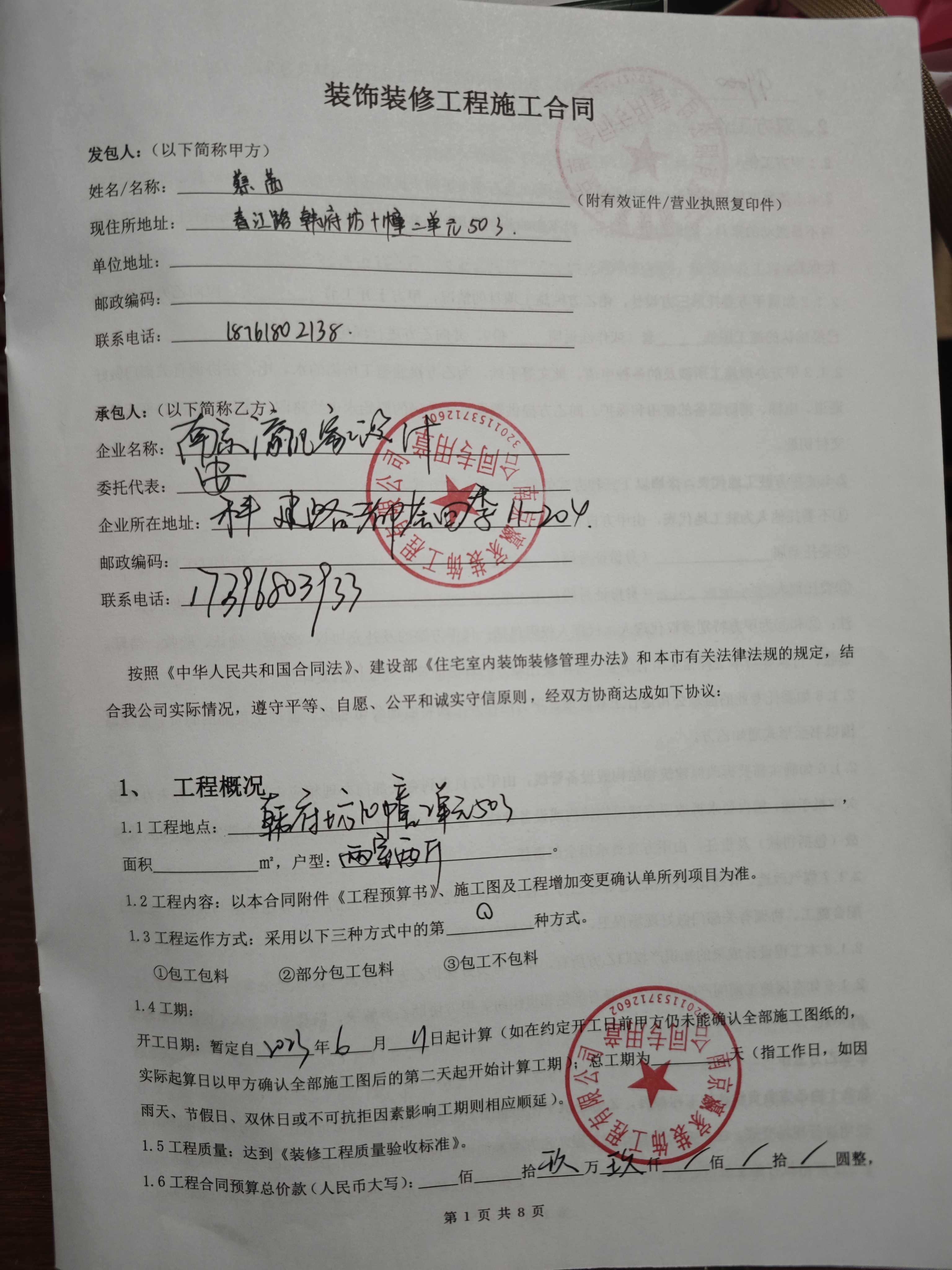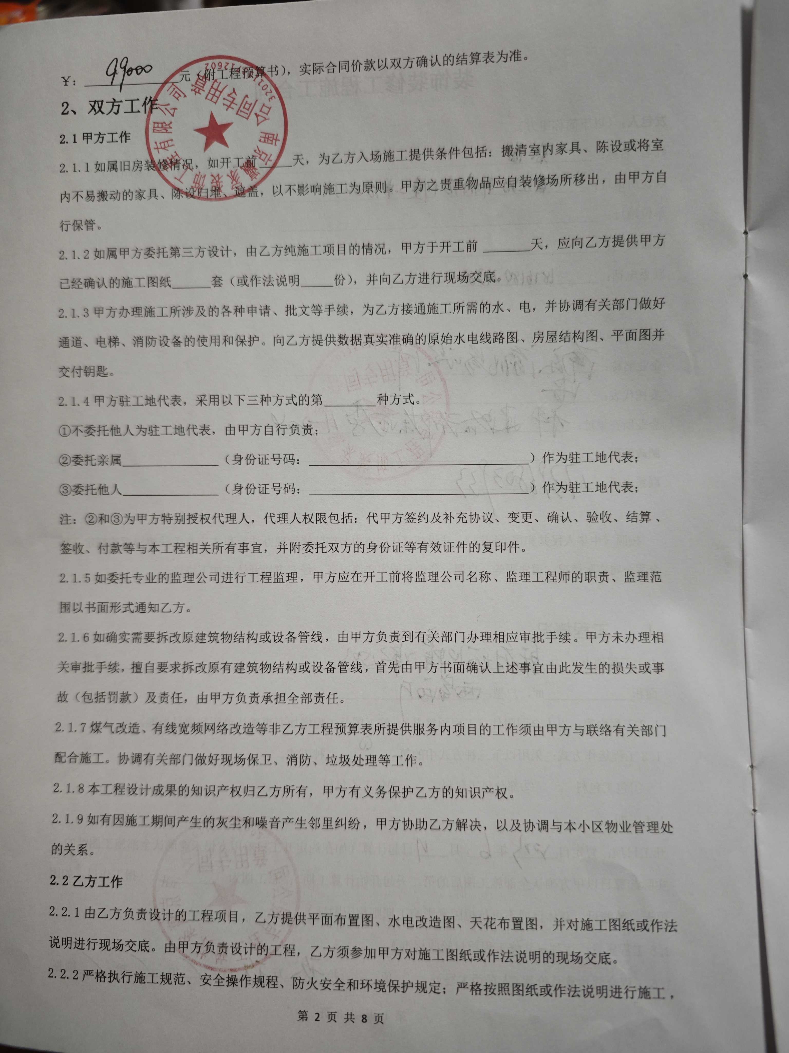 原告于2023年6月4号与第二被告人在江宁区科建路699号都会四季签约带有南京瀛家装饰工程有限公司公章的装修合同。在装修的整个过程中多次因为外部原因导致工期严重滞后,原告去公司与第二被告人进行沟通,双方约定同年9月底全部竣工。可是直到约定期已满,被告确迟迟未能完工。原告又给予了更多的时间期限。直到2024年4月份。第二被告人一直向原告传达的信息都是装修公司很稳定。直到4月底,原告质问第二被告人公司是否跑路,第二被告人也只是说声称公司因为资金问题做到四月底就不干了。没有提及任何公司跑路的消息。劳动节过后第二被告人才告知原告说公司跑路。剩余的装修工作没有工人做。之后原告多次与第二被告人沟通安装,却始终没有完工。一拖再拖。中途原告还被告知卧室房门被工人拿去变卖并无从找回。原告与第二被告人沟通希望第二被告人能再次与全屋定制的公司下订房门,第二被告人却以自己身上没有钱,自己只是打工人,并说原告的钱全部转给公司的跟他没有关系为由迟迟没有下单。之后第二被告人多次向原告承诺会完成剩余工作。但是一直没有进展。导致后面的工作一直无法继续。目前已经严重影响到我的工作和生活。无奈之下只能运用法律手段来维护自己的权益。