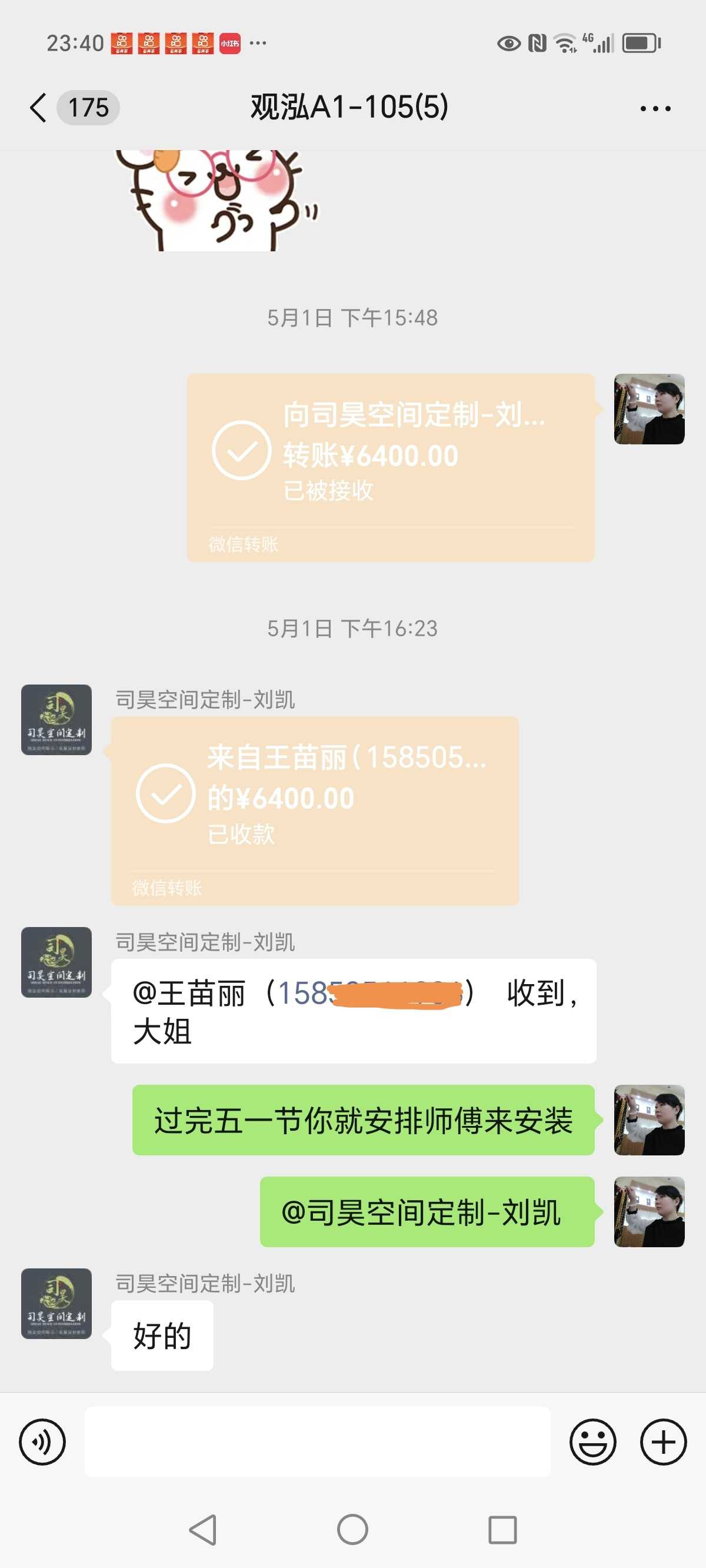 1本人与雨花台区富力尚悦居4楼409《司昊全屋定制》负责人刘凯签订合同,2024年3月份开工做柜子,到现在已经3个多月了售后推诿不处理。