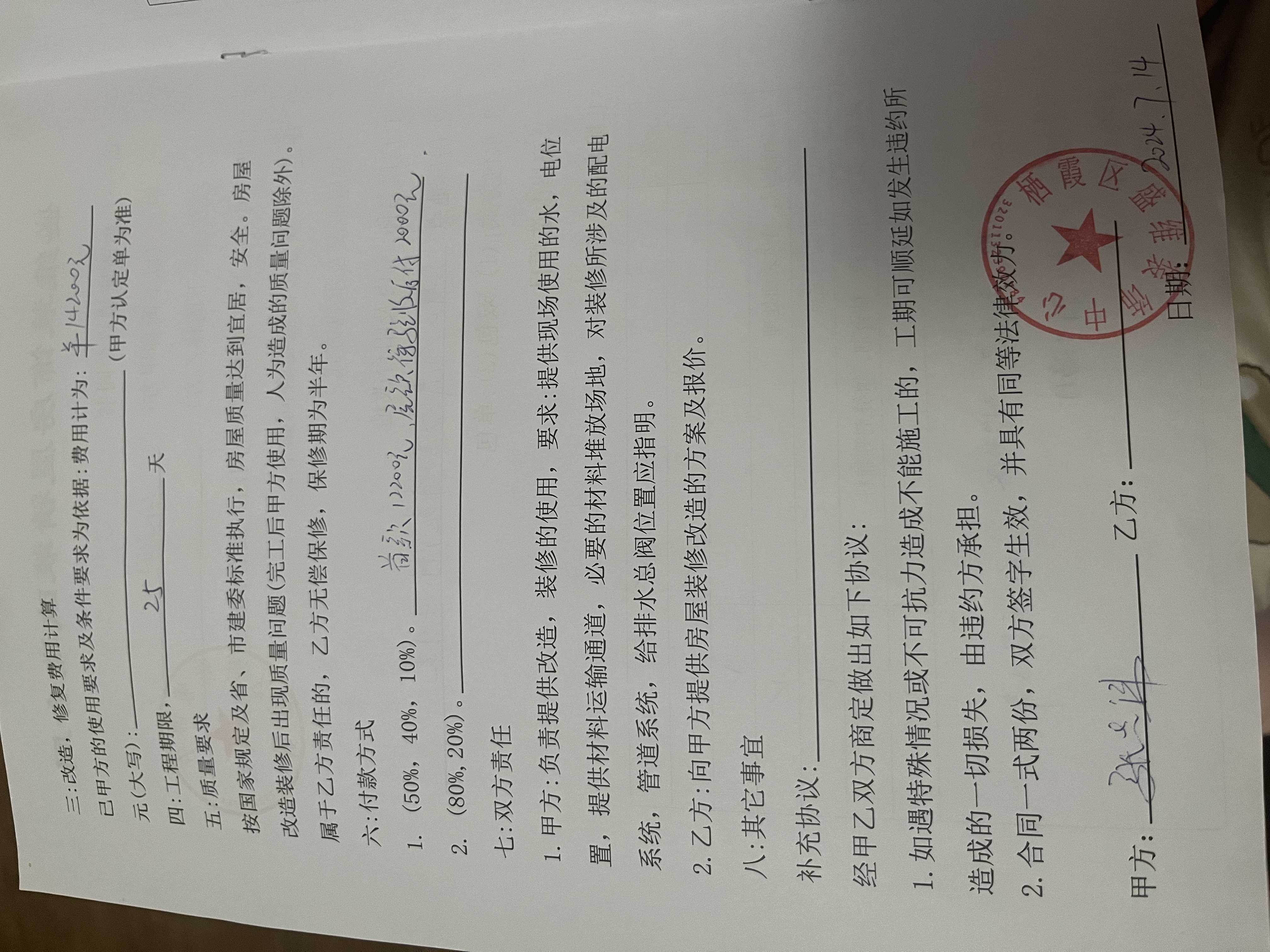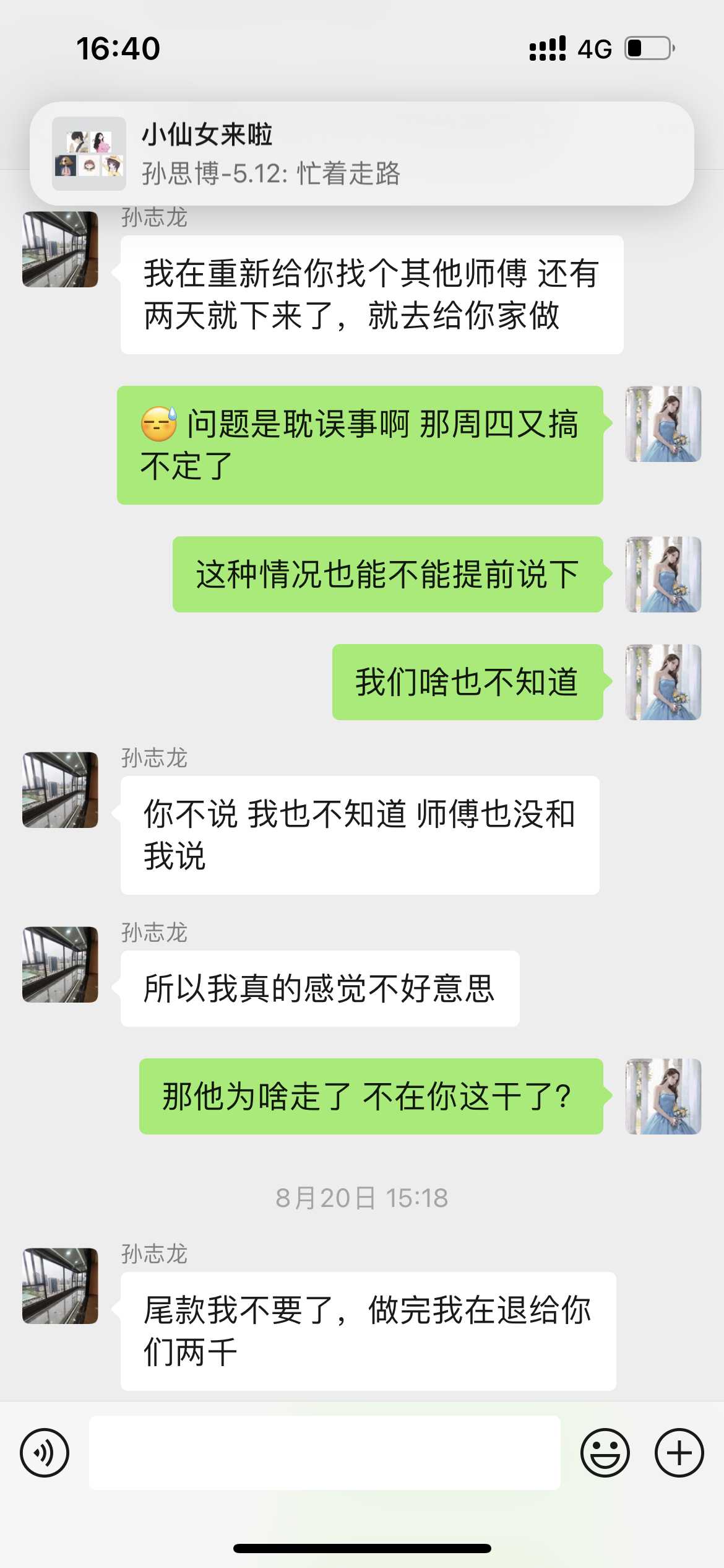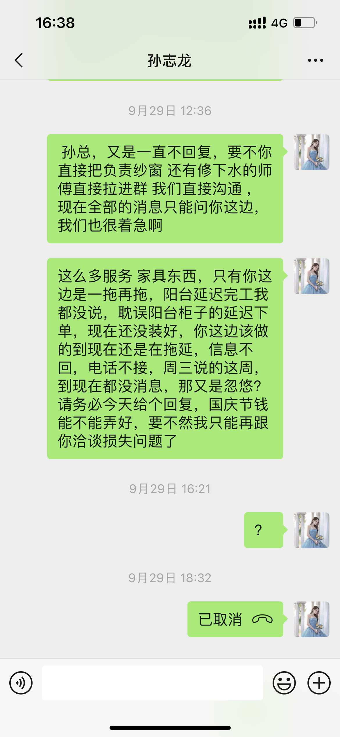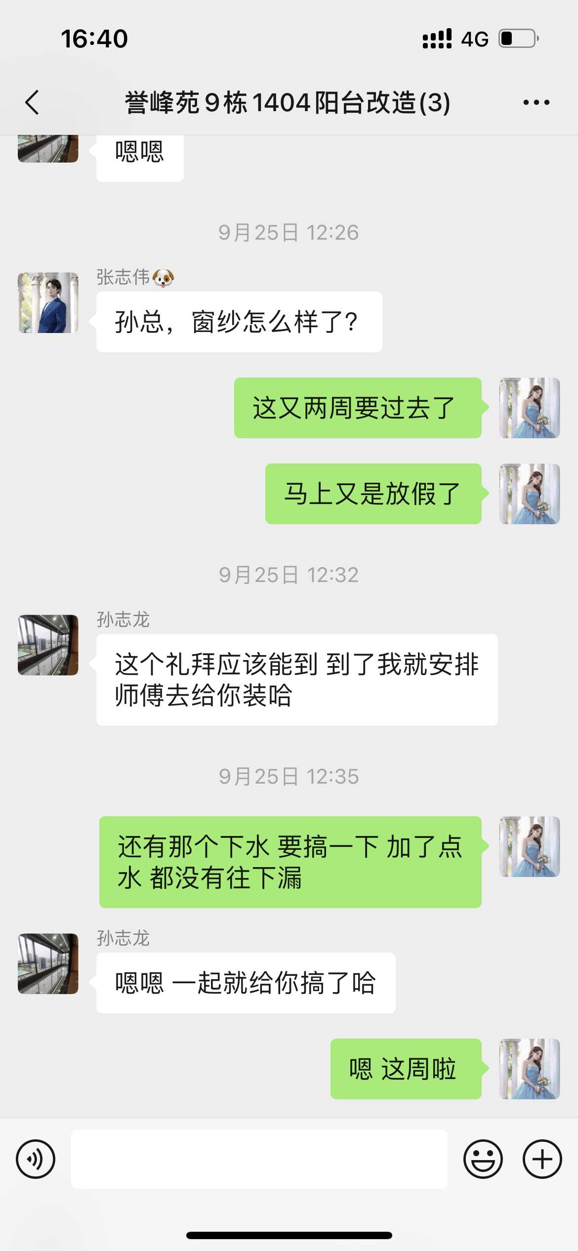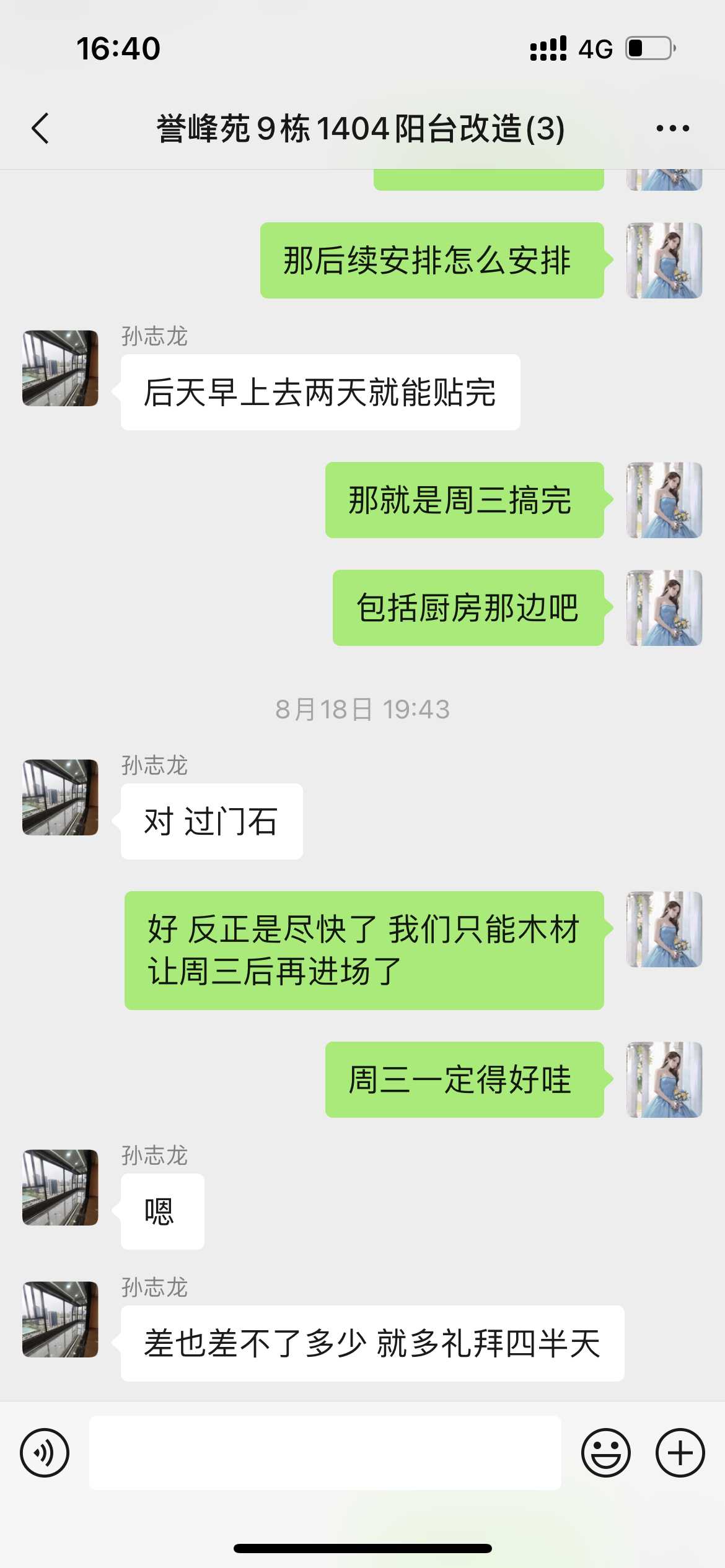 7月14日签约后,约定7.19日进场施工,实际过程中拖至7.18日,又拖至7.19日,过程中一直拖延施工进度,到8.17日进度始终缓慢:按周度进度看,第一周砸墙施工1天,第二周基本没干什么,第三周水电施工1天,第四周防水2天,第五周没有工人进场施工;33天工期过去仅完成阳台 厨房门的拆除,过程中一直督促,8月18日严肃沟通定于8月22日能完成贴瓷砖等瓦工的全部工作,实际8月20都尚未完成且工人没有提前通知情况下提前离开,对方都没有合理的解释,因据理力争,对方同意尾款2000元不收及做完后再退款2000元的方案,同时需另外找工人,8月24才安排新的工人完成瓷砖张贴,8.26日完成基本瓦工的活,8月27日发现部分贴的瓷砖掉落,及拆除部分修复不合理,水电未改等,一直督促进度,对方一直都是在安排在安排,直至9.3才完成阳台的瓷砖、吊顶、美缝;9.6查看地漏堵住、门缝未修复、部分插座未装,9.12日完成部分修复,直至9.17日地漏始终拥堵、纱窗一直未安装,9.25日沟通9.30前可以完成安装,实际截至10.6都尚未安装,并且从9.28日起对方微信不回复、电话不接,态度极其恶劣;
