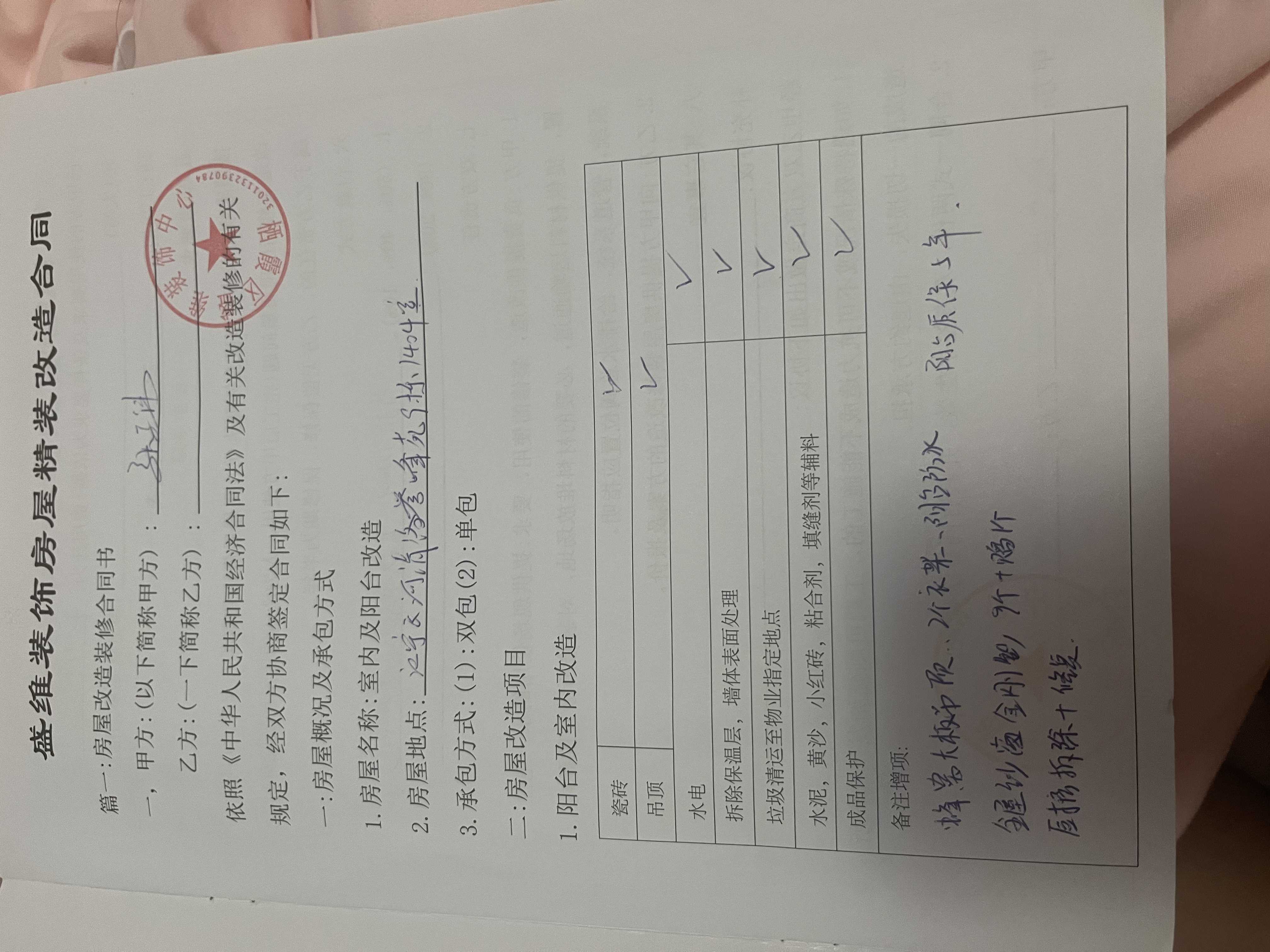 投诉人于2024年7月14日与栖霞区盛维装饰中心签订房屋改造合同,按约定室内及阳台改造,具体包含瓷砖、吊顶、水电、拆除,垃圾清运、保护等事项,特别备注吊顶为蜂窝大板材质,全屋纱窗(金刚纱10个),房屋拆除 保护,阳台质保5年,总款合计14200元,合同签订后支付首期款12200元,剩余2000元待交付验收后支付,合同约定工程期限25天,合同约定如发生违约造次的一切损失由违约方承担;