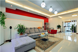 代简约风格就是这样的一幅出色的作品,颜色简洁大方,中间穿插的红色和直、白的造型设计不像有些人粗浅的理解的“直白”。在白色平面墙面中有着造型干枝花的点缀,有着石膏板造型墙面的凹凸立体,还有暗含的暖色灯带,使得电视背景墙充满了设计的匠心独运。再配合这装饰吊顶的烘托显得更加的精致和紧凑。