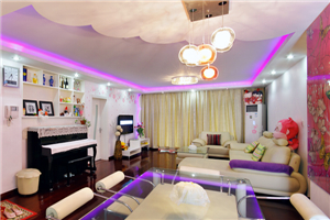 这是一位幼师MM的婚房家居毕业照,色调明艳活泼,可以看得 出来女主人性格活泼,讨人喜欢的。入户就看到正对的餐厅,设计师特别为女 主设计了一个“蝴蝶花”主题的钢化玻璃做装饰。而餐厅的吊顶也是花形的设计 与此同时客厅的对应一角也是花形的造型吊顶,相互映衬,非常和谐。