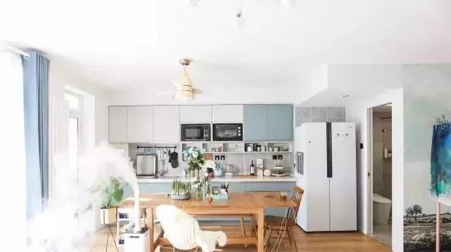 白色与木色的搭配,让空间看起来简洁的同时,又让人感觉很是舒适,餐桌上摆放着的插画,更加与木地板的质感结合起来了,空间内偶尔运用的蓝色,更是让人感觉有些宁静。