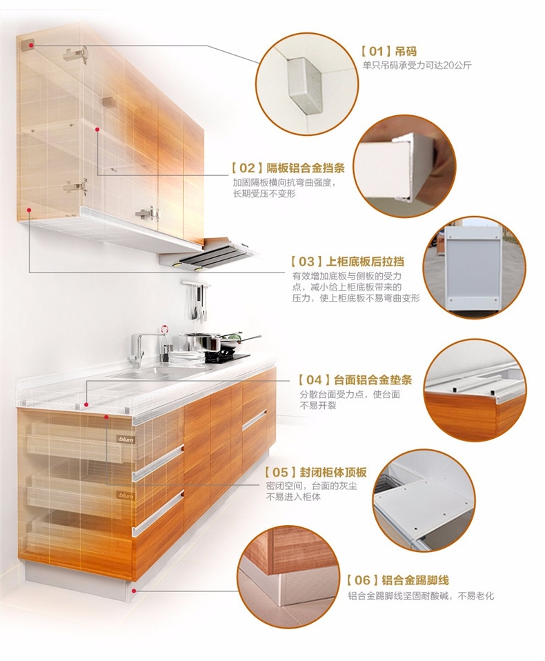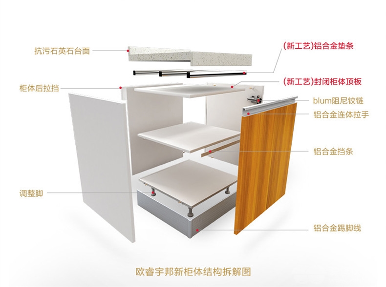 欧睿宇邦的橱柜都使用的是百隆的阻尼铰链,关闭橱柜门完全不用担心砰的合上门板,对门板造成损害以及产生噪音。百隆的五金上都印有身份象征的(BLUM)标志,验真伪看好这个标志。