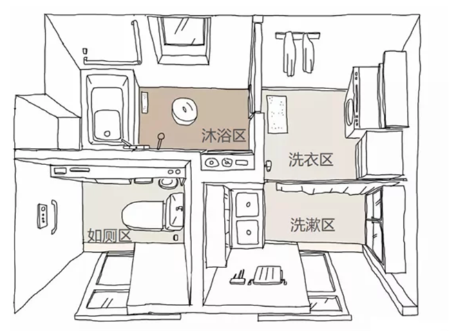 对于洗漱、淋浴、马桶三个区域的布局通常会按照使用习惯和使用频率来进行动线布局,即:洗手台→马桶→淋浴。