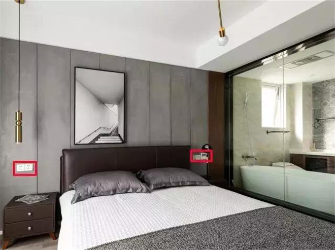 卧室安装插座主要考虑在床上要使用电子产品,床两边的插座可配置为带USB带开关的两孔插座,插座位置不要低!这个可以参考酒店设计,在床头柜以上10-15cm左右的位置。