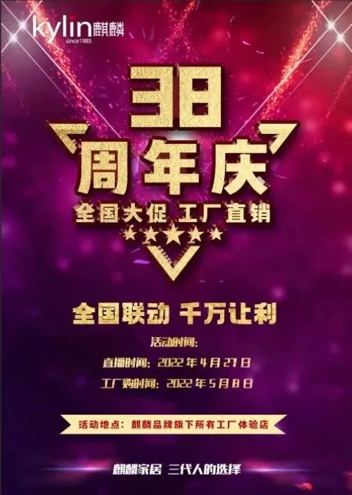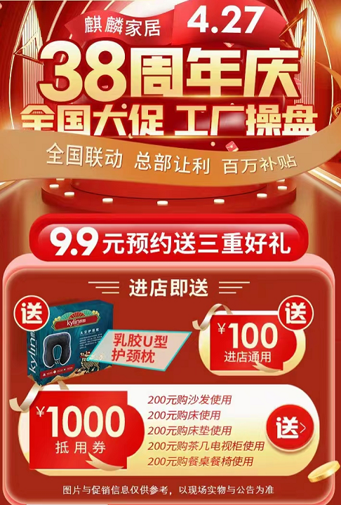 丰富的活动内容是我们过关斩将的攻坚利器,巨额的优惠补贴是我们披荆斩棘的战力保障。这次“麒麟家居三十八周年庆暨全国大促营销”,麒麟人必将剑锋所指,所向披靡。