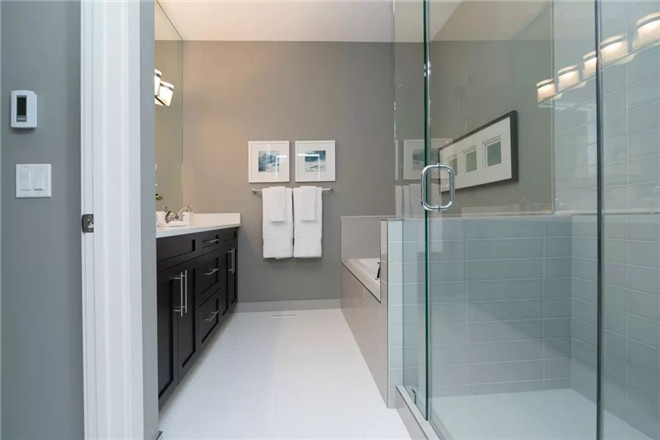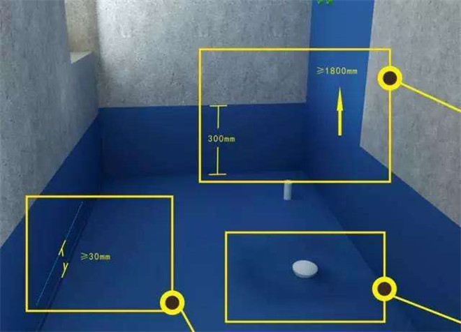 为了达到较好的防水效果,一般卫生间的墙面上也要做大约30cm高的防水处理,防止积水洇透墙面。与浴缸相邻的墙面,防水处理的高度也要比浴缸上沿高出一些,淋浴要达到180cm的高度。
