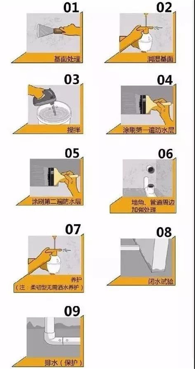 施工前确保工地干净、干燥,防水涂料要涂满,无遗漏,与基层结合牢固,无裂纹,无气泡,无脱落现象。涂刷高度一致,厚度要达到产品规定要求。