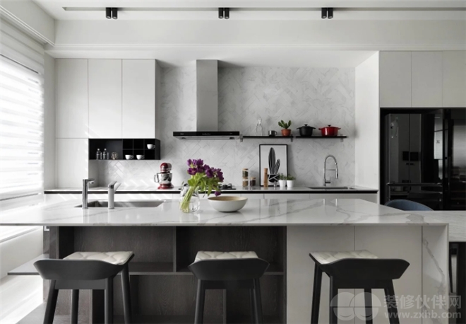 有条件的可以尝试开放式厨房,空间足够大的话,中间还可以摆放一张中岛台,也可以当吧台使用,看起来会比较大气,中岛台的台面建议选择进口岩板,质感会非常好。