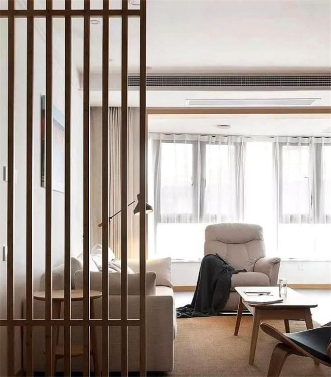 玄关处打造了屏风,避免大门直冲客厅,但是为了空间尽可能的通透,拍屏风采用了木格栅的材质。既保证了客厅的隐私性,又让采光足够通透。