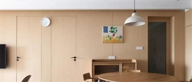 餐厅背墙与电视背墙共享一个面,餐桌选用圆形木质成品,餐椅也是原木风格,整体显得非常洁自然大面积的木饰面装饰,让空间彰显出大气的氛围。