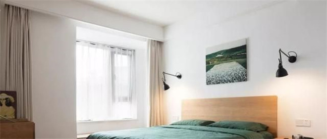 主卧的床头背景墙上安装了黑色伸缩式壁灯,舒适实用又好看。墨绿色的床品,对于整个空间气质的提升起到了关键作用,白色纱窗、米色窗帘,让整个空间能够非常自然的衔接在一起。