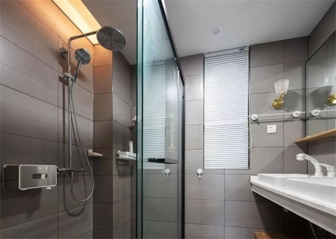 卫生间通过玻璃推拉门的形式,实现了彻底的干湿分区。双台盆的设计,让日常生活使用更加便捷,台板下方的收纳区,也能够完美的解决卫生间区域的收纳需求。