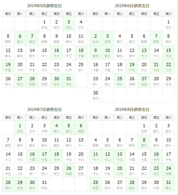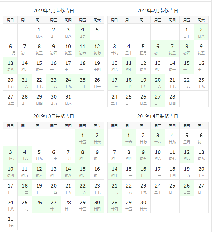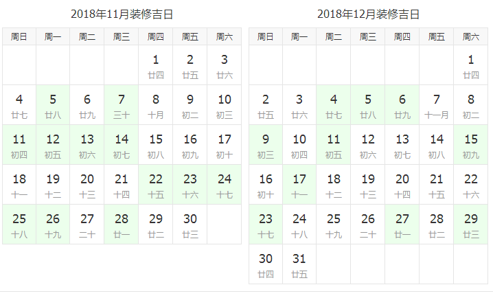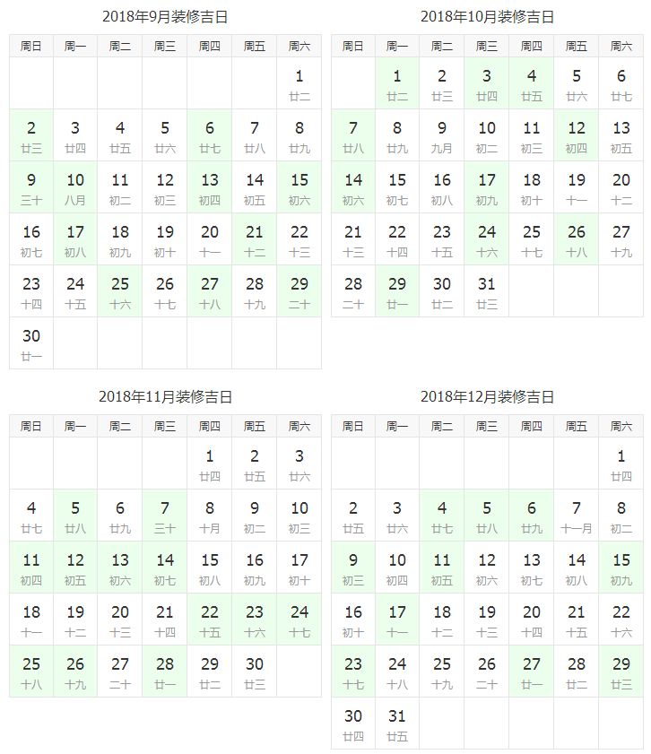 以下绿色背景的2018年装修吉日,未经您八字命盘核准,某些日子可能与您八字冲煞,不建议直接取用。