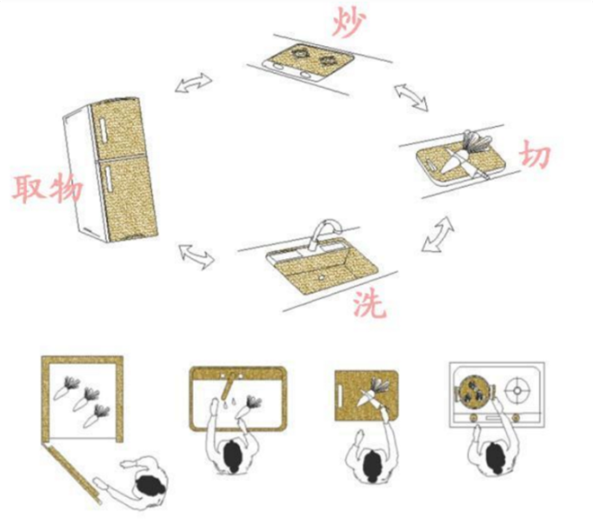 厨房面积再大、功能再齐全,如果动线错误就是最大的败笔。厨房的动线应该满足:取物——洗——切——炒,四个功能完美衔接一步到位,如果动线出了错,在厨房操作的时候就会手忙脚乱浪费时间。