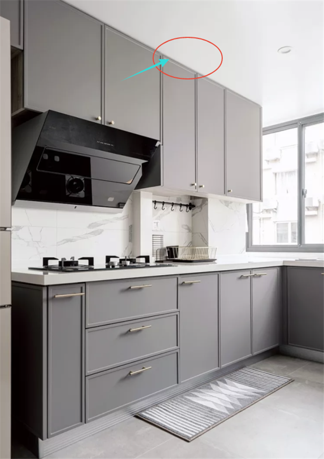 订做整体橱柜一定要注意柜门做过多造型会导致卫生难以打扫,藏污纳垢,后期会很心累。所以橱柜门最好选择平直、光滑易打理的门板。现在还比较流行安装无拉手弹簧器开关,或者隐形极简拉手,都更便于我们打扫厨房卫生。吊柜需要注意与天花板之间连在一起,不要留空隙,不然后期简直是清洁死角,各种积灰很难清理干净。