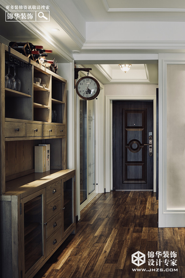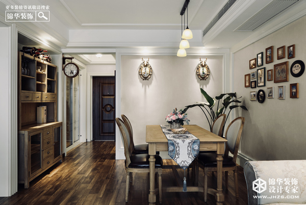 餐厅基本采用的都是木质家具,木质的桌椅、橱柜,墙上木质的相框与钟表交相呼应着整个布局。原木自然色调为基础,表现出浓浓的美式风格。