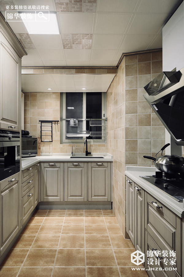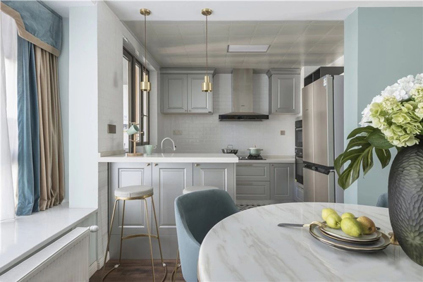 简单干净的橱柜线条、带着一点复古风情的墙砖、让厨房在视觉上看着更加的高端,很好的体现了美式装修风格。