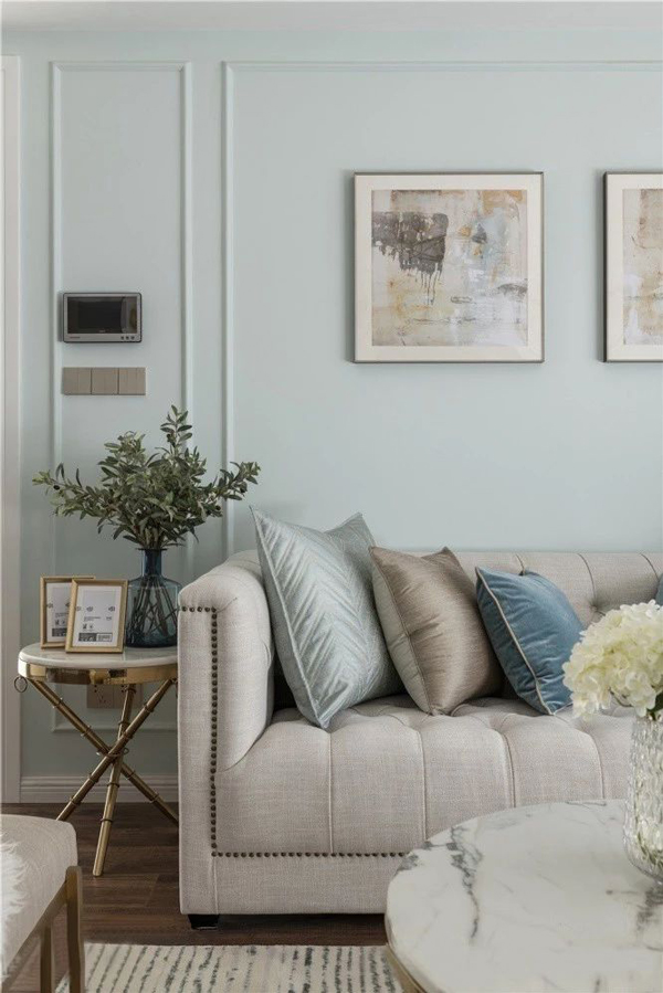 浅蓝色系的主色调,浅浅的蓝色背景墙,与蓝色的沙发、窗帘交相呼应着。富有艺术气息的茶几、灯具烘托出舒适与淡然之感。地毯的铺设也缓解了地板带来的凉意。