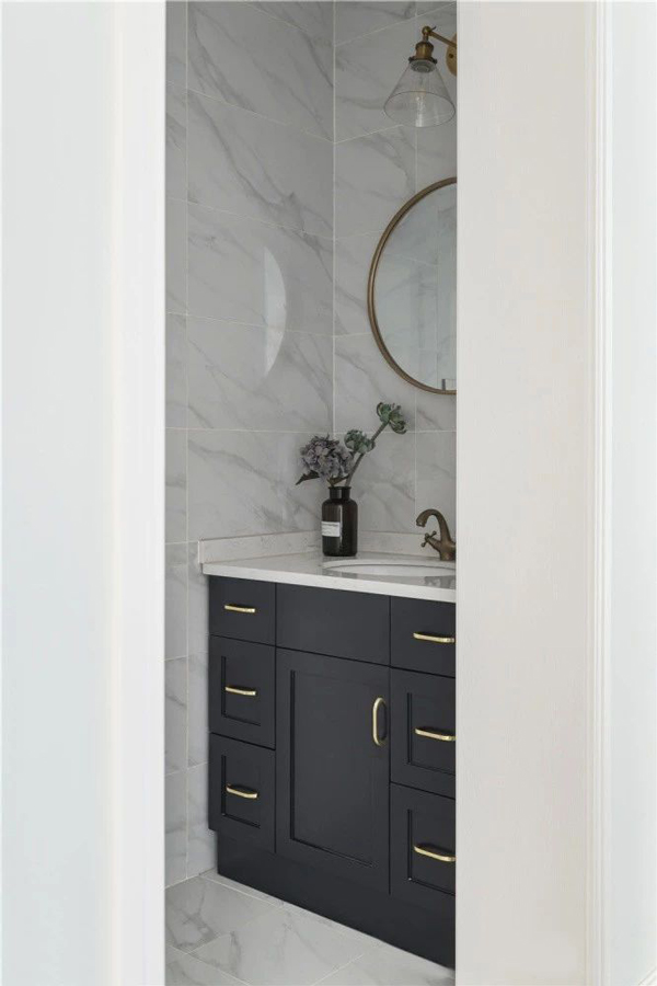 充满纹理的大理石墙砖、黑色系的柜体搭配上金属质感的镜子,沉稳内敛不失格调之感。