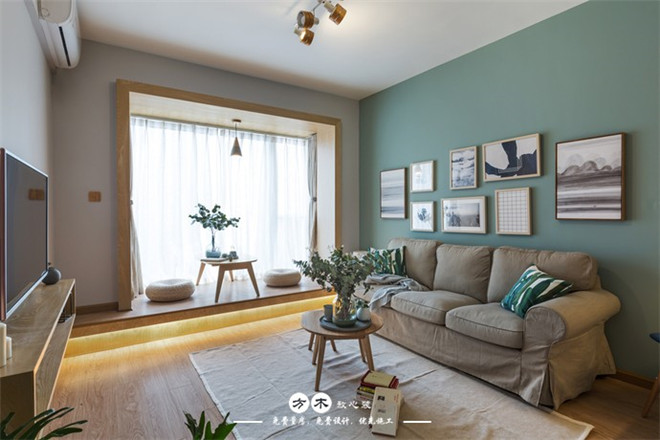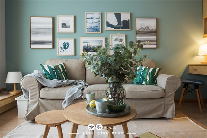 布艺沙发搭配木制的茶几、圆形拼接的双重茶几,以及活动有趣的画作照片墙,不同寻常的设计感,让人觉着意趣盎然。
