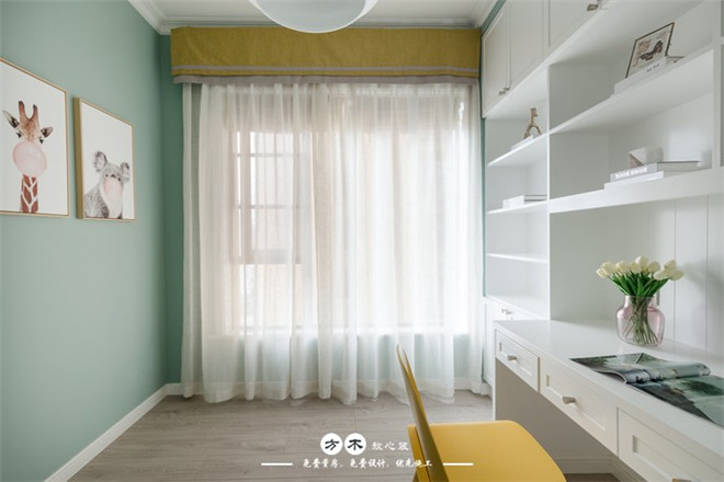 小书房定制了一面墙的到顶大柜子,预留了充足的储物空间,未封闭的隔板可以放置书籍、装饰物等物品。这个多功能区域空间不仅仅可以当做书房,亲友来访之时,还可以当做客房。