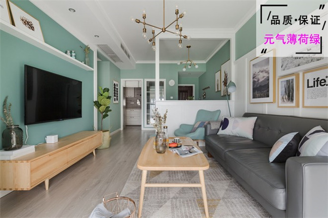这一套装修案例采用了元气薄荷绿为主色调,局部白色跳色。这一套同样也是绿色系,却给人一种不一样的感觉,喧嚣忙碌的世界中,家里永远是元气满满的。