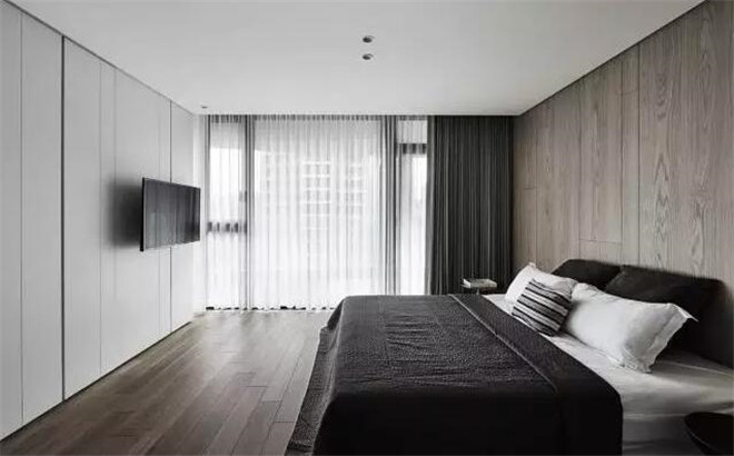 不同于客厅的整体色调,卧室采用了轻松的原木亮色,让卧室这个休息区域变得更加轻松舒适。半透明的白纱窗帘,让光线洋洋洒洒的进入卧室,身处这样一个空间,会不自觉的放松很多。