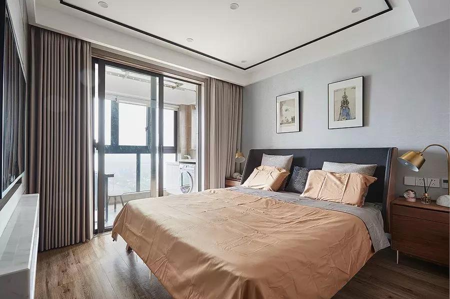 主卧室的布置同样是简约与活力并存,通过灰色调背景,搭配浅橙色的床单被套,床头柜上复古风的台灯让沉寂的主色调变得活跃了起来。