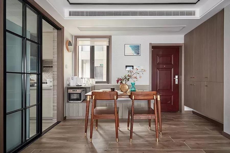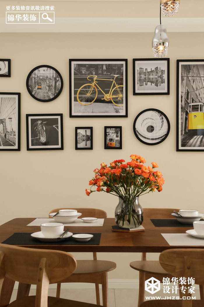 复古风的照片墙、简约的木制桌椅,充满着人性化的设计。餐桌上再放上一束鲜花,疲惫了一天回到家,一桌热气腾腾的饭菜,幸福就是这么简单。