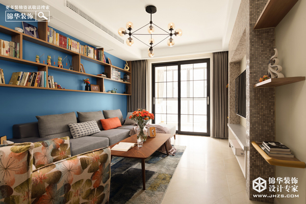 蓝色的墙面漆和整个客厅其他的颜色形成强烈的色差对比,这个是装修中常采用的一种方式,视觉色彩更加鲜明。