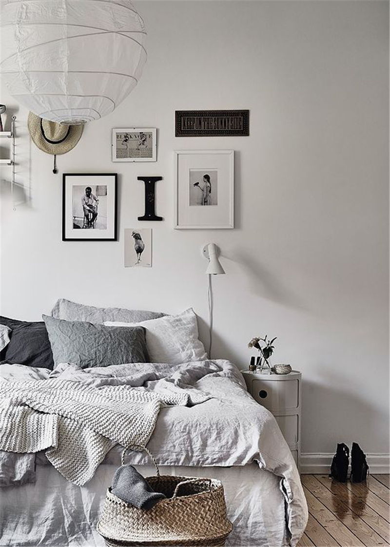 一般是挂于背景墙或者卧室门正对的墙壁,高度要和整个卧室的搭配相协调,以画面中心稍高于站立视线为佳。不过要是对于自己的颜值自信的各位不如把画随意的摆放在地上(北欧风中经常会出现)。一般床头挂小幅装饰画对于数量没有啥限制,可以规规矩矩的摆成条形、方形,也可以比较随意的上下错位。个人建议比较有味道的方法是选择几幅大小不一的,错落有致的摆放在床的侧边(哈哈,至于为什么不摆头上,小编胆小,怕砸下来把本来得大脸砸的更大了),在选择装饰画时也记得和床品的颜色要统一,这样子设计更能融为一体。当然装饰画选择对比色也是好看的,不过要注意色彩之间的搭配。