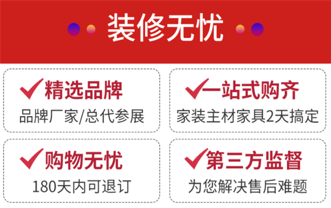 精选品牌、品牌厂家/总代参展;一站式购齐、家装主材家具2天搞定;购物无忧、180天内可退订;第三方监督、解决售后难题。