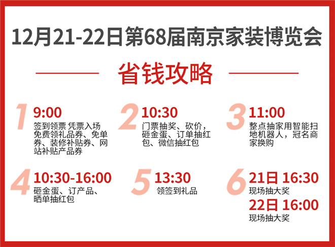 友情提示:需要逛展采购的南京市民可以在网站免费索取第68届南京家装博览会展会门票,现场签到领票,凭票参加活动领礼品。