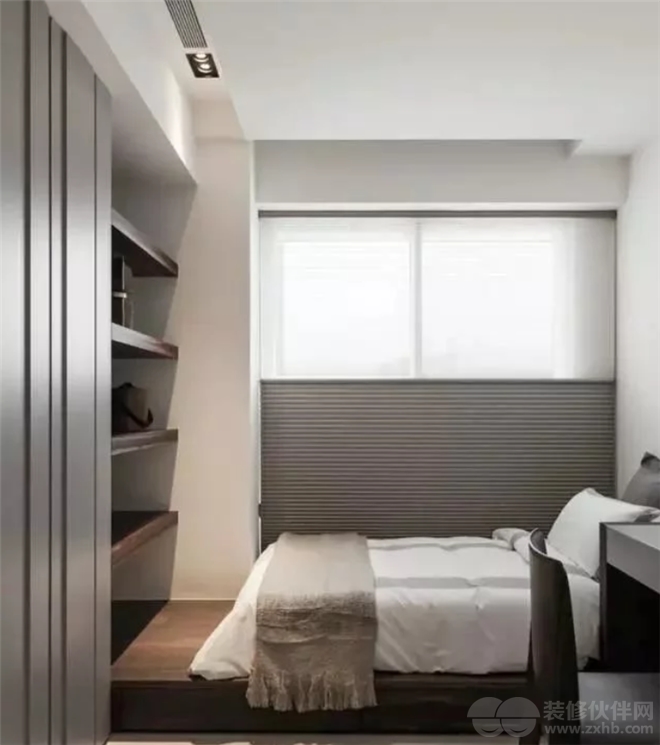 而床尾和床头部分也可以充分利用起来,打造简单实用的一体式衣柜;或将衣柜与书桌融为一体,巧妙地提升空间的功能性。