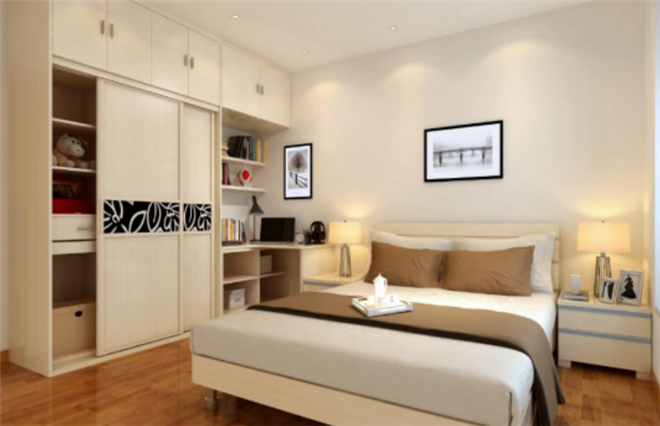 2、卧室打造柜体时可以选择定制,定制的橱柜可以更好的贴合墙面。打造到顶的大衣柜,除了柜顶不会积灰方便打扫以外,还能让整体空间感更强,相比分隔开的柜子,空间上更显高。